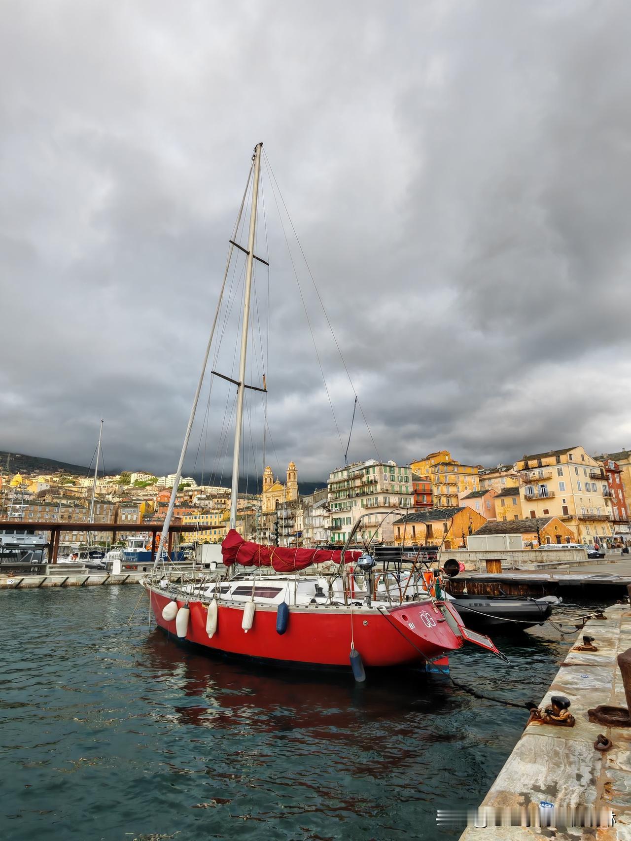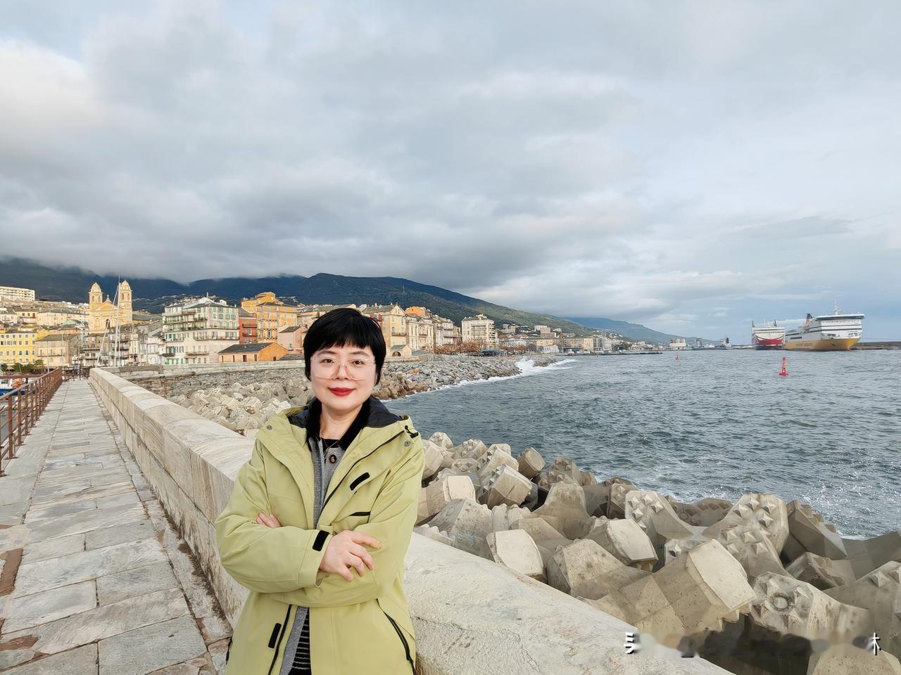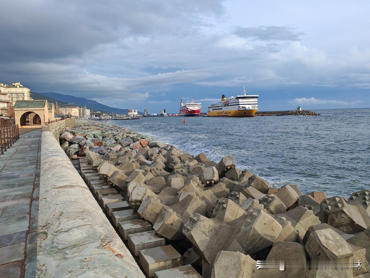 2️⃣ 巴斯蒂亚老港(Le Vieux Port de Bastia)是科西嘉岛东北部巴斯蒂亚市的著名景点,它坐落在一个天然港湾内,15世纪热那亚人的防波堤环绕,保留着浓郁的地中海风情。港边彩色的房屋紧密排列,俯瞰着餐厅和咖啡馆的露台,港内停泊着小游艇和色彩斑斓的渔船,巴斯蒂亚教堂⛪的两个塔楼从建筑物的缝隙中格外抢镜。南岸的Mantinum是一个观景台,是老港与城堡之间的连接点,俯瞰地中海的同时感受时代的变迁,这里有着浓郁的意大利痕迹,无论饮食还是文字。 夜晚的巴斯蒂亚海湾,浪涛会因科西嘉海峡的地形与夜间海风的叠加变得格外汹涌,数米高的浪花拍打着老港的石砌防波堤,溅起的水雾在夜色里晕开,与岸边暖黄的灯火交织出极具冲击力的画面。由于昨天开启的科西嘉中度雨涝天气,因此风高浪急雨密🌧,让我看到了巴斯蒂亚海湾的夜色,而清晨雨停之后的太阳☀又从云缝中钻出,带着一抹金色的亮色为港口增添了欢快。 沿着海湾大道向灯塔走去,听着急促的海浪声🌊,闻着海水的腥味,远眺浩瀚的地中海,终于在离开这里前看到了美景🛳