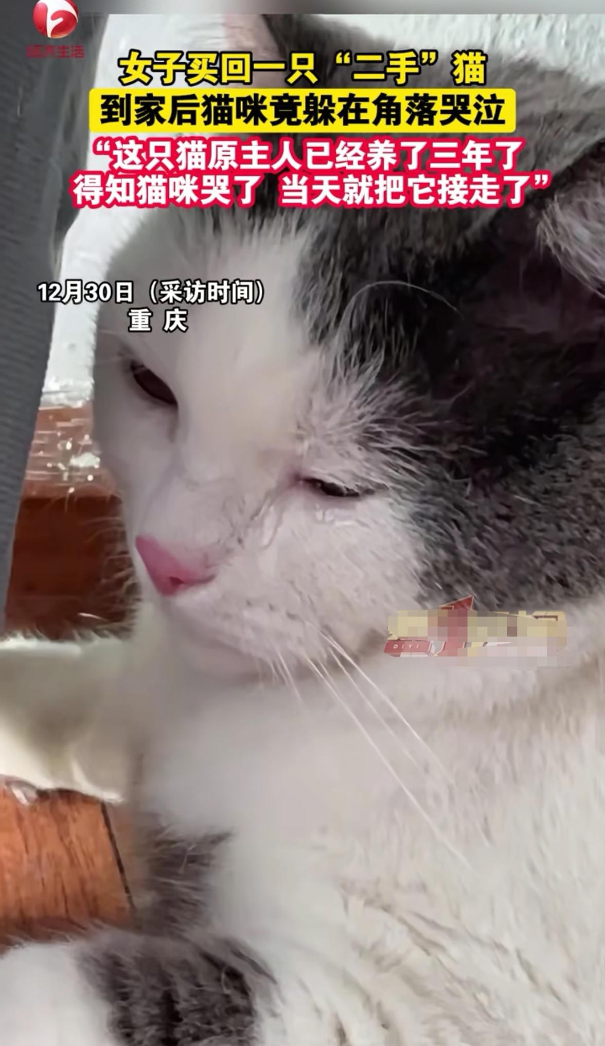 万万没有想到, 重庆,一猫主人将自家的猫 卖给了一名女子,女子拿到猫时, 觉得不但长得乖巧还特别温顺,抱回家后, 这猫也是显得安安静静的,可没一会女子却发现猫咪独自躲在角落不肯出来。起初女子也以为是猫不熟悉环境害怕,没想到走到猫面前才发现,这猫居然在角落里默默流泪。 视频里,猫咪眼眶湿润,眼角挂着泪,模样低落又悲伤。女子说,这猫跟原主人三年了,路上就安静,到家后先躺会儿,接着就躲角落哭。女子觉得它是舍不得原主人。原主人看到消息赶来,猫咪“喵喵”叫,最后主人决定不卖,把猫接回了家。 这事儿在网上炸开了锅。有人说猫咪能听懂话会哭,也有人觉得猫流泪可能是生理问题。细想,动物和人相处久了,难免有感情。虽说不能确定猫哭是不是单纯因为情感,但这一幕确实让人动容。 咱们对待宠物,是不是该多些慎重,少点随意买卖呢?大家咋看呀?