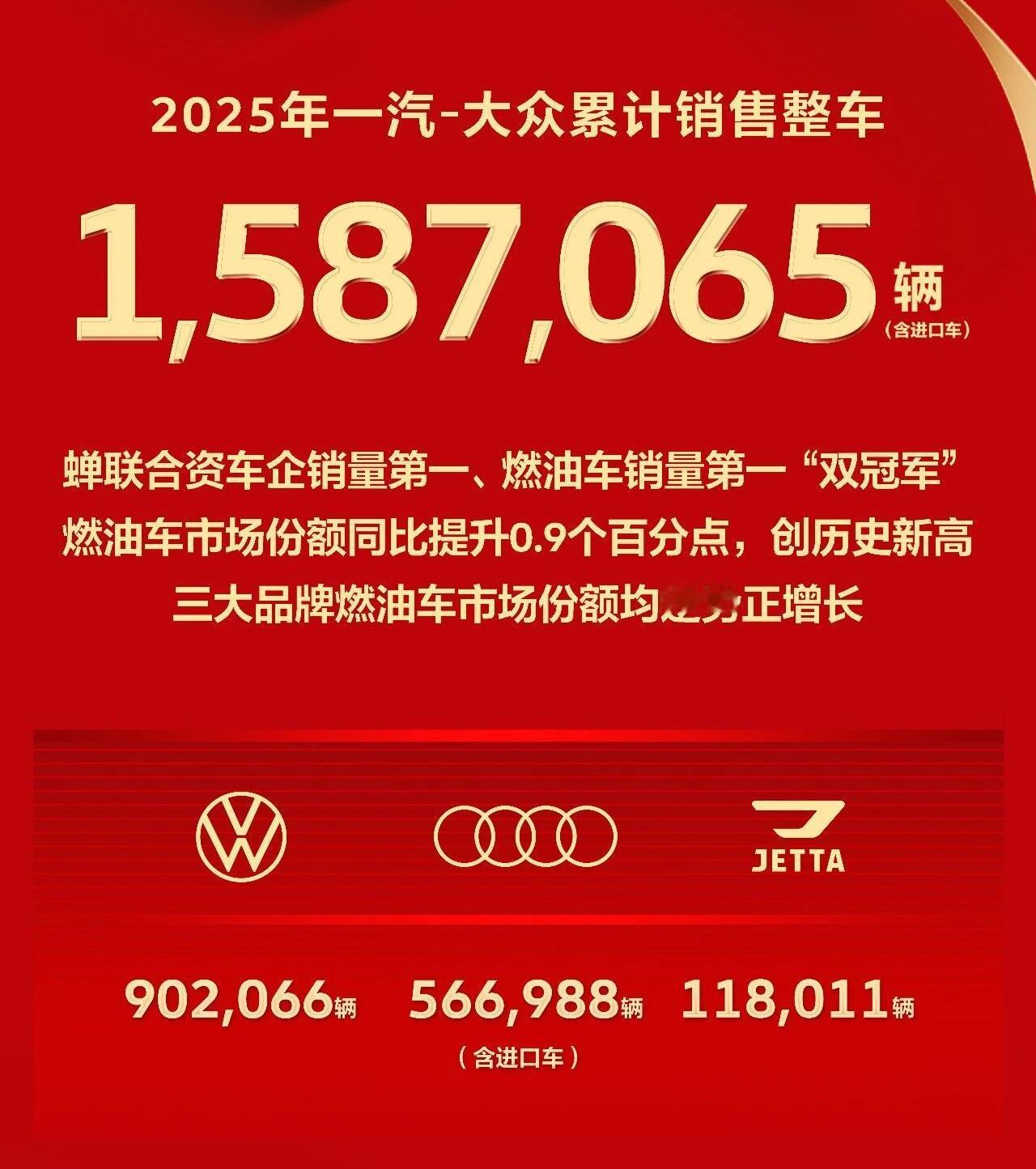 【燃油车市占率新高!一汽-大众2025年销量超158万辆】日前,一汽-大众官宣:2025年整车销量超158万辆,燃油车市占率创历史新高!其中,大众品牌90.2万辆,奥迪品牌56.69万辆(含进口车),捷达品牌11.8万辆,再次蝉联合资车企销量第一、燃油车销量第一“双冠军”。【来自懂车帝车友圈】