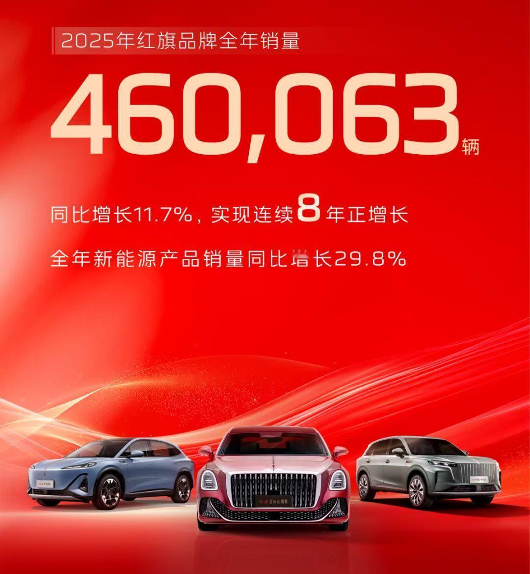 【同比增长11.7%,一汽红旗2025年销量突破46万辆】日前,一汽红旗官宣:2025年红旗品牌全年销量突破46万辆,同比增长11.7%,实现连续8年正增长,持续巩固自主豪华品牌领跑地位。其中,红旗新能源产品全年累计销量14.9万辆,同比增长29.8%;红旗金葵花产品销量1404辆。【来自懂车帝车友圈】