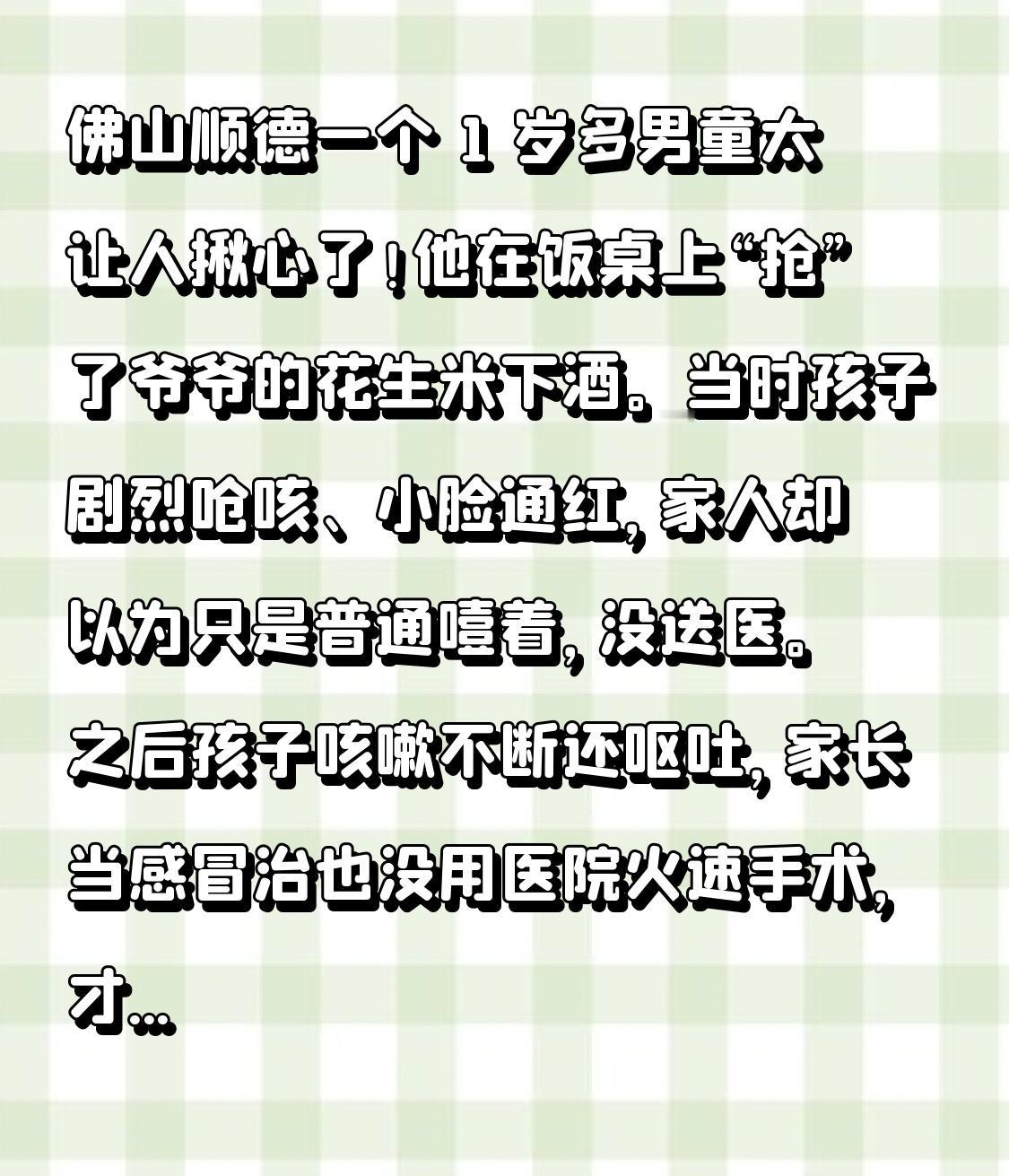 佛山顺德一个 1 岁多男童太让人揪心了!他在饭桌上“抢”了爷爷的花生米下酒。当时孩子剧烈呛咳、小脸通红,家人却以为只是普通噎着,没送医。之后孩子咳嗽不断还呕吐,家长当感冒治也没用 医院火速手术,才把孩子从鬼门关拉回来。而且这医院一周内就收治两例类似情况,还有个孩子被板栗卡了气管。医生提醒,3 岁以下孩子别碰花生、瓜子、板栗,家长真得重视儿童乱丢零食