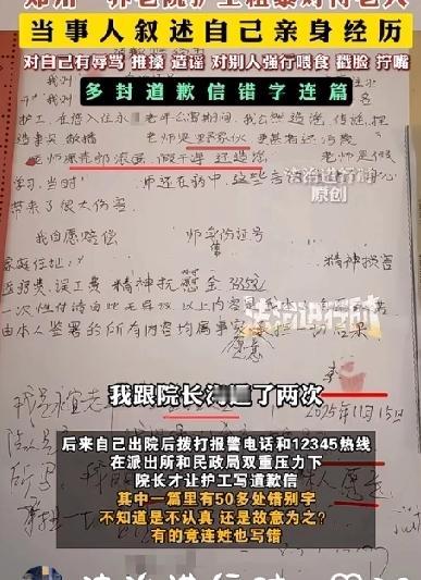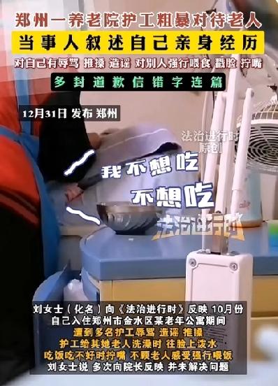 太气愤了!郑州一养老院粗暴对待老人。手抓面条放勺子里强行喂老人,不好好吃饭就拧嘴,护工边用针管戳老人还边说“修理不了你了”! 近日,郑州某老年公寓护工粗暴对待老人的一段视频在社交平台发酵:画面中护工直接用手抓取面条放入勺子,强行喂给老人,另一段视频里还出现护工用手戳击老人头部的行为。据爆料,更可气的是因为老人不好好吃饭,护工会拧老人嘴,用洗澡水泼脸,甚至用针管戳老人口腔喂水,护工自己嘴里还说着“修理不了你了”! 事后被虐待的老人虽然收到了护工的道歉信,但是其中的一篇竟然有50多处错别字,说没文化可以理解,但是能把自己的姓都写错真的不是故意的吗?给你一巴掌再道个歉就可以一了百了吗? 既然自己选择成为护工,就应该拿着工资,好好的做好自己的本职工作。人都有老的时候,试想虐待人的护工她自己老了以后也被人这样对待,她能受得了吗?这起事件引发了网友们的强烈愤慨,大家纷纷指责该护工的恶劣行为。养老院本应是老人们安享晚年、得到悉心照料的地方,可如今却成了部分老人的“噩梦之地”,实在是让人痛心疾首。目前该案件还在进一步调查处理中,但是值得反省的是,整个养老机构的管理监督以及培训问题!