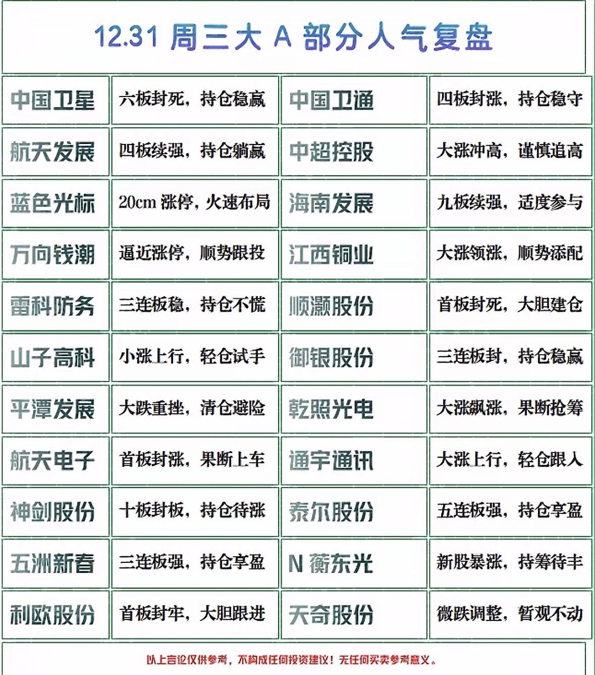 12月31日星期三人气股复盘 A股年末强势股盘点:卫星、卫通、 航天领涨,铜业、防务稳升, 部分个股需谨慎追高,投资需理性