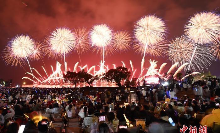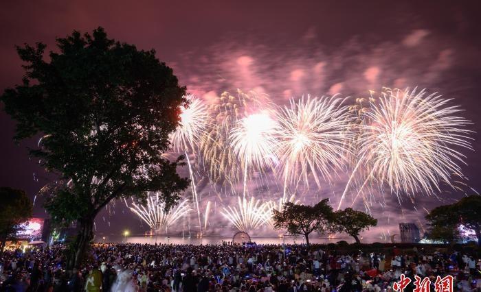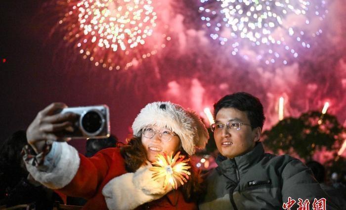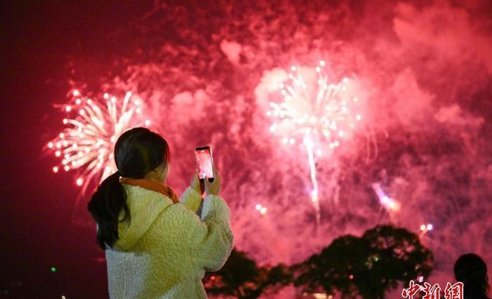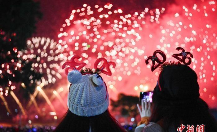 【重庆:璀璨烟花点亮跨年夜】2026年1月1日,民众在长寿湖畔观看烟花秀。2025年12月31日晚,数万名观众齐聚重庆长寿湖畔的重庆天空剧院,沉浸式体验“焰遇重庆·跨年烟花许愿夜”,在璀璨烟火中迎接新年的到来。重庆跨年夜 (记者 何蓬磊 摄)重庆:璀璨烟花点亮跨年夜