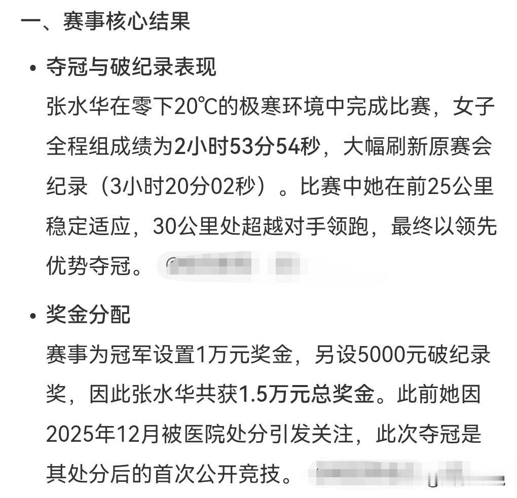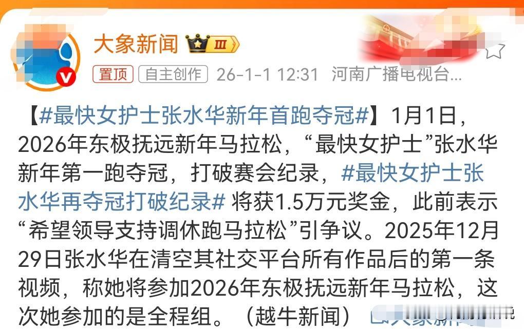 有一说一,这个女护士挺厉害的,确实适合跑马拉松啊,又夺冠军了,获得1.5万的奖金。 2026年1月1日,最快女护士张水华新年首跑夺冠。 不仅夺得了冠军,而且还打破了纪录。 这耐力真的是杠杠的,别看人长得瘦,这耐力太强了。
