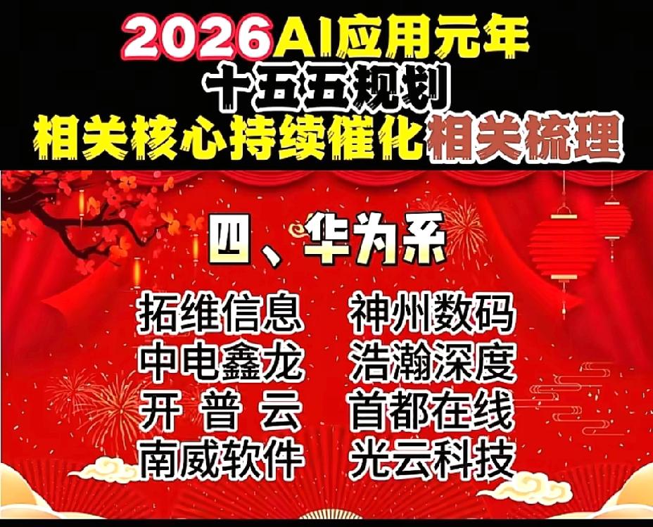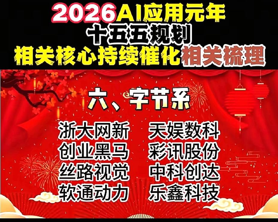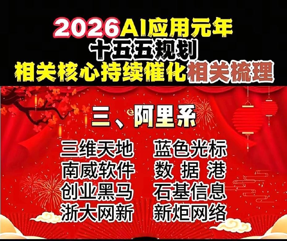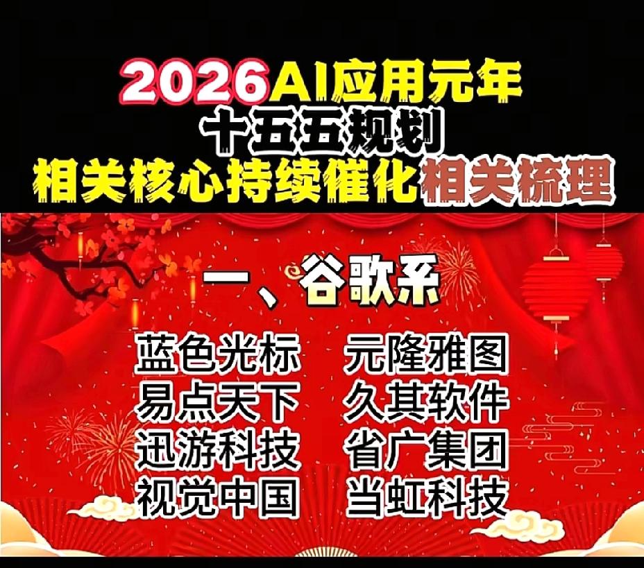 2026年1月1日,节后A股这些板块有望大涨!!! AI应用元年,十五五规划相关核心持续催化相关数列,重点关注:谷歌概念:蓝色光标、元隆雅图、易点天下;OpenAI概念:昆仑万维、万兴科技、捷成股份;阿里概念:三维天地、数据港、南威软件;华为概念:拓维信息、神州数码、开普云;腾讯概念:用友网络、长亮科技、卓易信息;字节概念:创业黑马、中科创达、天娱数科;百度概念:每日互动、银之杰、奥飞数据;智谱AI概念:豆神教育、汉得信息、法本信息;deepseek概念:拓尔思、广和通、华金资本!!!