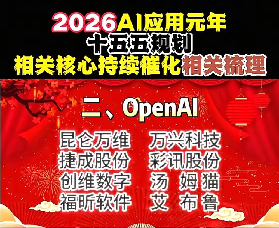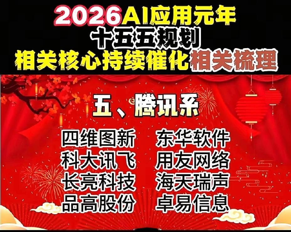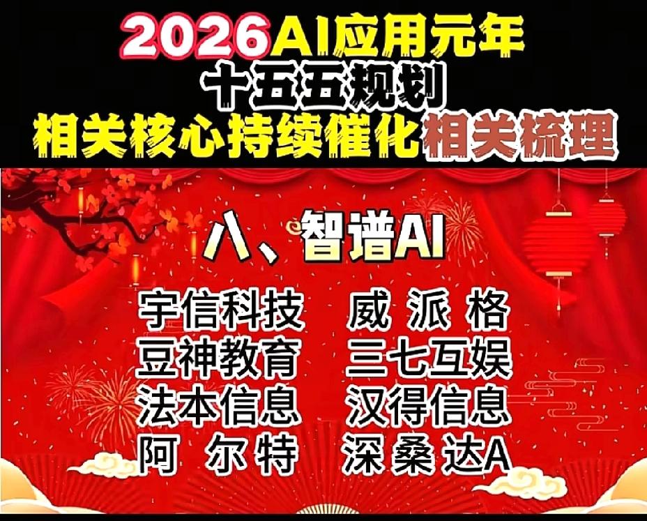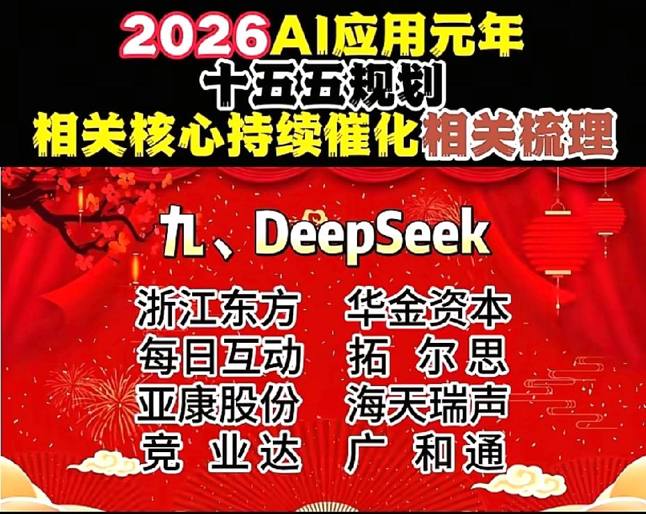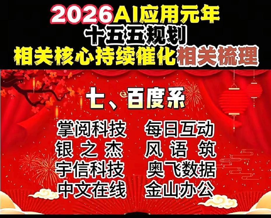 2026年1月1日,节后A股这些板块有望大涨!!! AI应用元年,十五五规划相关核心持续催化相关数列,重点关注:谷歌概念:蓝色光标、元隆雅图、易点天下;OpenAI概念:昆仑万维、万兴科技、捷成股份;阿里概念:三维天地、数据港、南威软件;华为概念:拓维信息、神州数码、开普云;腾讯概念:用友网络、长亮科技、卓易信息;字节概念:创业黑马、中科创达、天娱数科;百度概念:每日互动、银之杰、奥飞数据;智谱AI概念:豆神教育、汉得信息、法本信息;deepseek概念:拓尔思、广和通、华金资本!!!