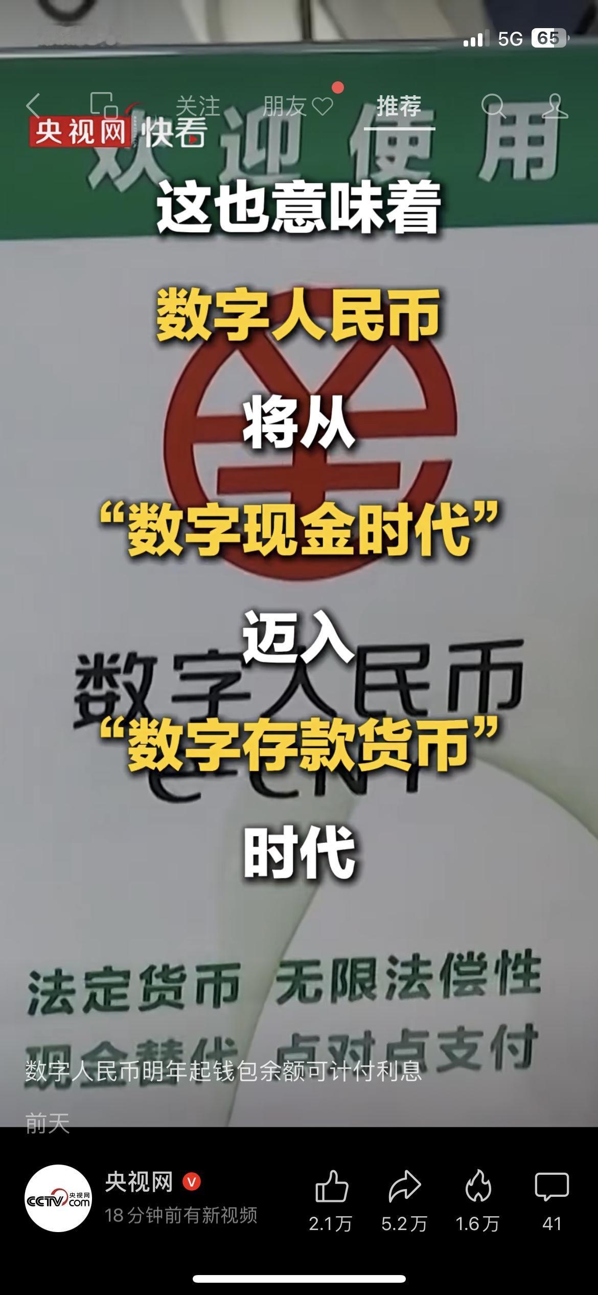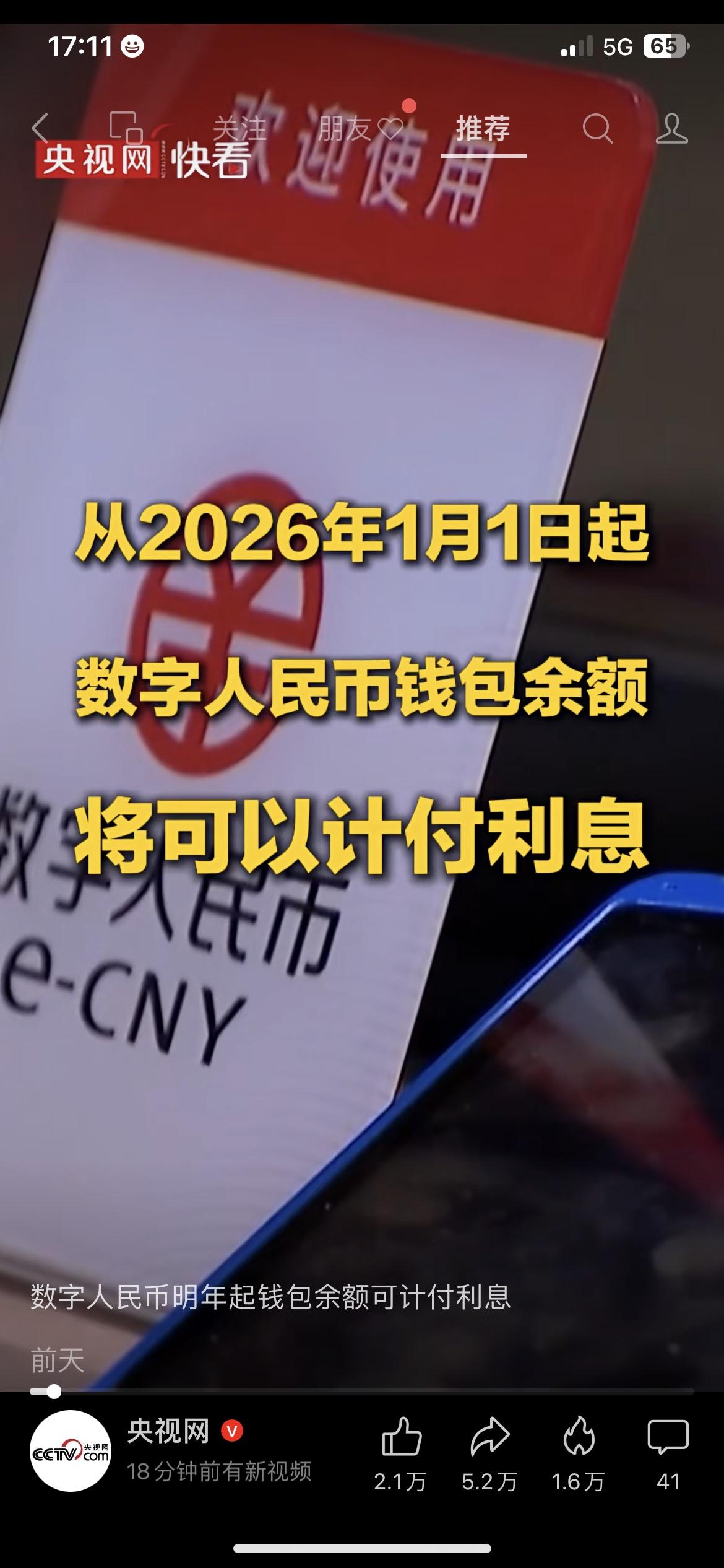 炸了!2026数字人民币正式生息!现在躺着赚钱,比支付宝微信还香! 刚刷六大国有行官宣,立马冲来跟大家说!2026年1月1日起,数字人民币钱包余额真能生利息了!以前就当个电子现金花,现在直接变“能赚钱的数字钱包”,这波国家福利真的太顶了! 就是带e-CNY标志的这个钱包,不用存银行定期,不用买理财,平时买菜、交水电费剩的零钱,躺着就能钱生钱!咱这可是全球首例央行数字货币计息,妥妥走在世界前头,必须夸一波! 给大家扒3个最关键的点,全是干货,看完赶紧去查自己的钱包! 1️⃣ 利息咋算?零操作躺赚! 六大国有行统一按银行活期存款挂牌利率算,央行基准0.35%,部分银行还能上浮10%-20%,实际能到0.385%-0.42%!不用手动操作,按日计息、每季末月20日结息,21日自动到账,还暂免个税,蚊子再小也是肉,积少成多超香! 2️⃣ 安全吗?双重保障稳到爆! 完全不用瞎担心!数字人民币是央行发行的法定货币,国家信用兜底,现在还直接纳入存款保险,钱包里的钱最高能赔50万,和咱们普通银行存款一个安全等级!非银支付机构还得交100%保证金,根本不怕资金被挪用,比微信支付宝还踏实! 3️⃣ 啥钱包能享?用着麻烦不? 划重点!一类、二类、三类实名钱包都能计息,四类匿名钱包不行,没实名的赶紧去App补全信息!用起来完全没变化,该扫码、碰一碰支付照样来,没网没电也能付,利息自动算自动到账,纯纯无感升级,新手也能轻松拿捏! 咱算笔明白账:以前零钱放微信支付宝,要么没利息,提现还得掏手续费;现在数字人民币,支付免费、转账免费,还能躺赚利息,集方便、省钱、赚钱、安全于一身,这不就是零钱最佳归宿嘛!现在10家运营银行都能办,微信支付宝关联的网商、微众银行也在内,超市、外卖、便利店都能付,普及越来越快了! 赶紧打开数字人民币App,看看你家钱包是不是实名账户!已经开通的朋友,评论区说说你打算把哪笔钱转进去生息?还没开通的抓紧冲,早开早赚利息,这波国家羊毛可千万别错过!数字货币 数字人民币资产 数字货币转型