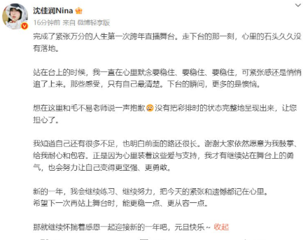 3、受得住嘲。很多艺人遇到全网黑都会撑不住,跳出来自证,但是沈佳润每次都是照单全收,别人说她气息不稳她就练体能,昨晚唱歌跑调没有说是音响问题耳返问题,直接接受批评并道歉,态度好的没话说,让人没办法再怪他。
