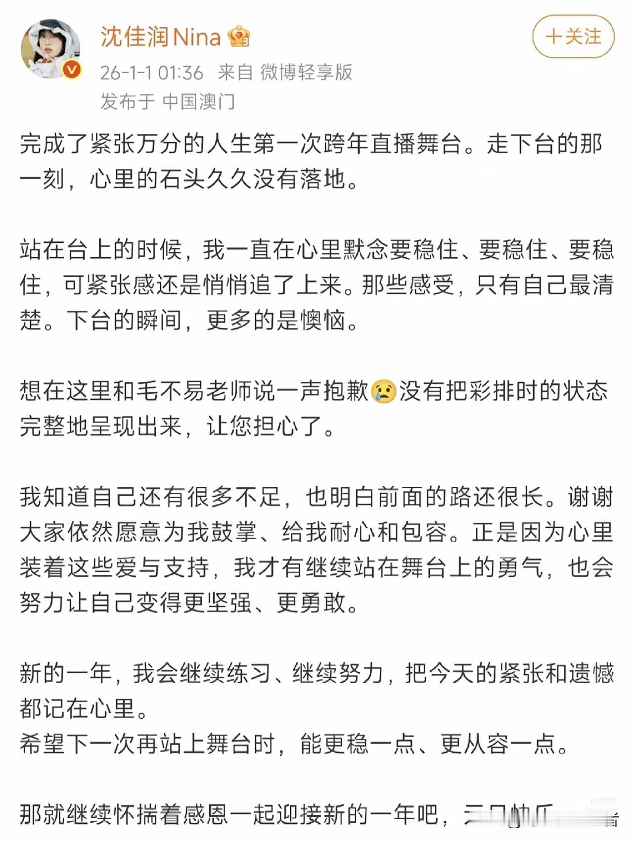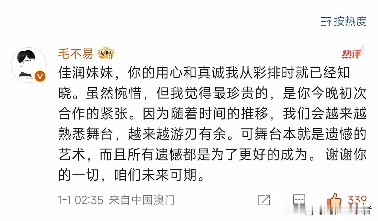 沈佳润居然和毛不易道歉,这两人怎么了? 原来沈佳润和毛不易合唱《不染》,结果拍子没拿准,开头有点跑调,毛不易这也是在一旁默默帮助。 沈佳润真的好像国民闺女,这舞台实习,有点过错不是指责,都是鼓励。