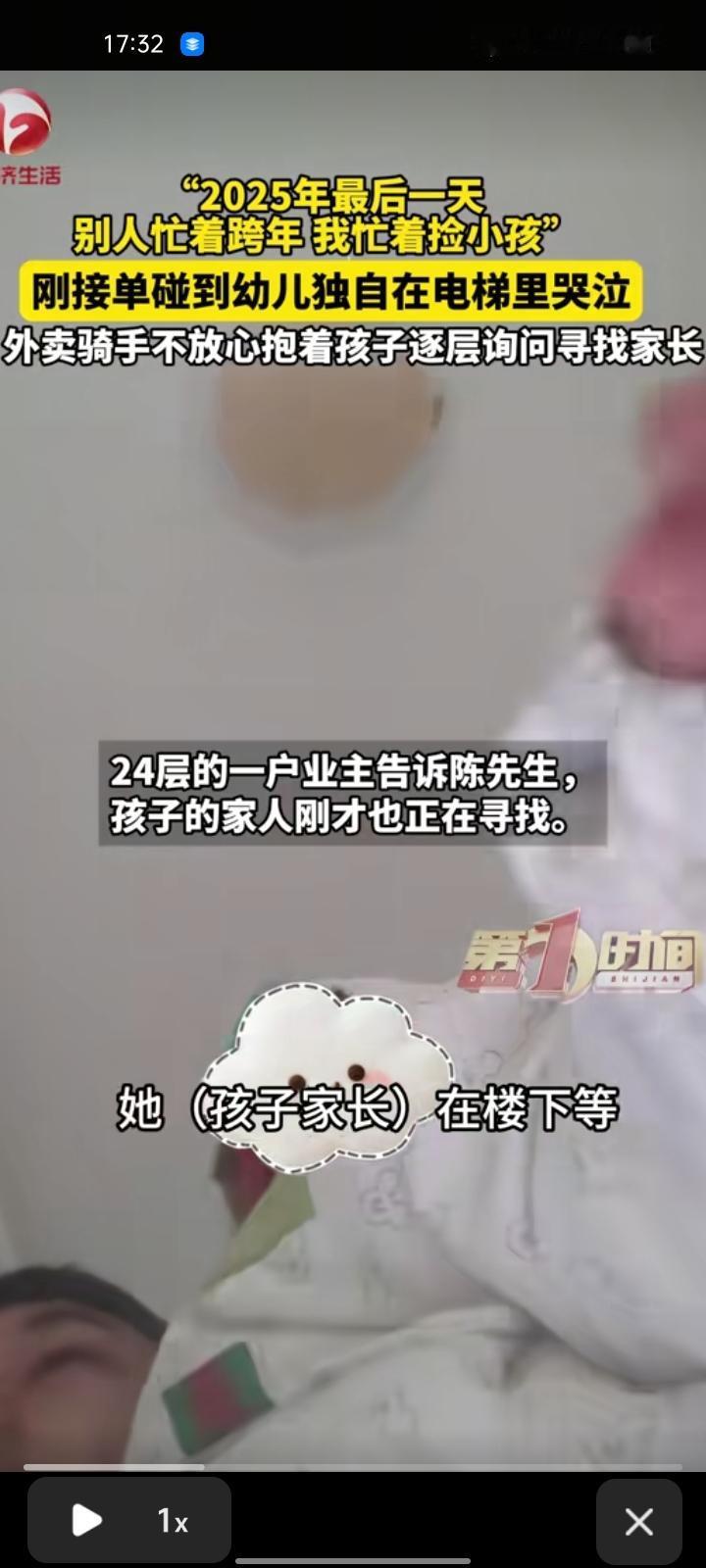 12月31日,江苏南通。外卖骑手陈先生刚接到一个单,碰到一个小朋友独自在电梯里哭泣。由于孩子还小说话不清楚,陈先生担心孩子的安全,就抱着孩子一层一层敲门询问,结果,24层业主说孩子的家人刚才也在寻找。随后,陈先生又折返下楼寻找孩子家长,下楼过程中正好碰到了。 确认了孩子家长的身份后,将孩子交给家长,陈先生又急忙去送单了。别人都忙着跨年,而他忙着捡小孩。