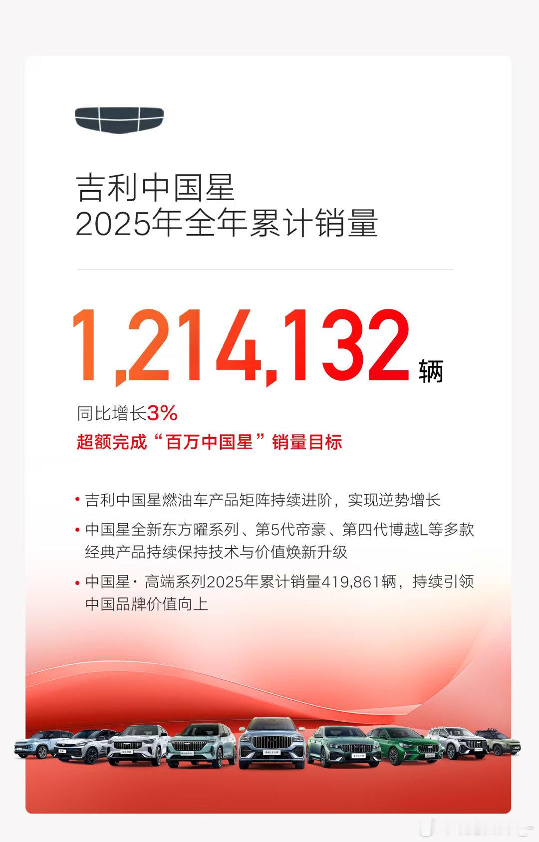 超额完成目标,吉利今年卖出去302万辆车,燃油车板块,吉利中国星2025年全年累销突破121万辆,真不是靠运气。死磕安全技术、玩命搞专利,连天上地下的出行网络都在悄悄布局。这种笨功夫,现在看真值了。新能源爆了,银河冲得飞快,极氪和领克还把价格撑住了,而且,燃油车也没丢,家底厚,转型才不慌。全球化也升级了,不止是卖车,跟雷诺在巴西建厂、在海外直接生产,这是要下场当庄家、定规矩了。体系打扎实了,路才能越走越宽。吉利全年销量超302万超额达成目标吉利2025销量爆发式增长欧尼茜茜