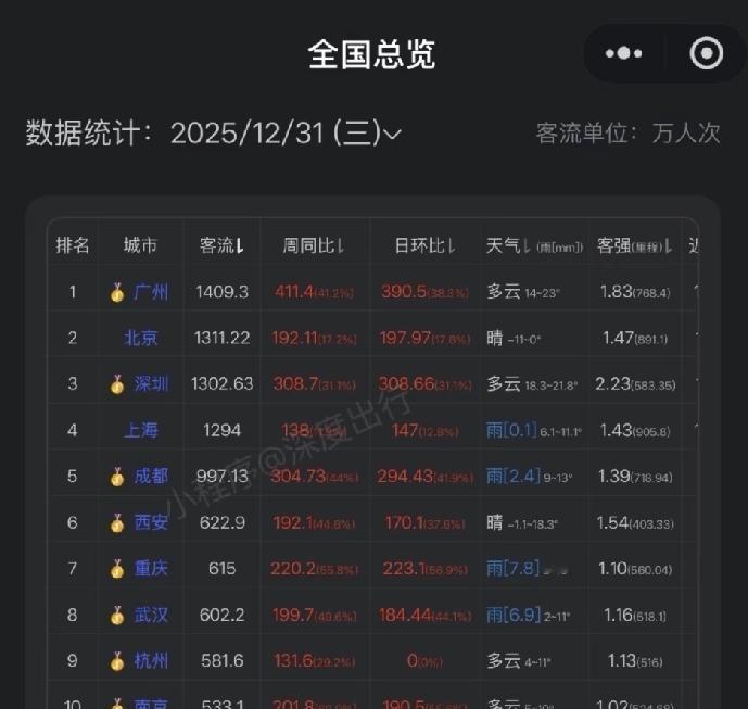 跨年夜地铁客流:十强城市齐创新高 全国新高 1400w级:广州 1300w级:北京、深圳 1200w级:上海(接近1300w) 1000w级:成都 600w级:西安、重庆、武汉 500w级:杭州、南京 各梯队城市地铁客流的增幅,是年轻人“说走就走”的勇气,是家庭团聚“温暖同行”的默契,是城市文旅“花式整活”的底气。哪怕寒潮来袭、雨水添乱,人们依然选择奔赴,因为跨年夜的地铁,载的是中国人民对新一年的期待。