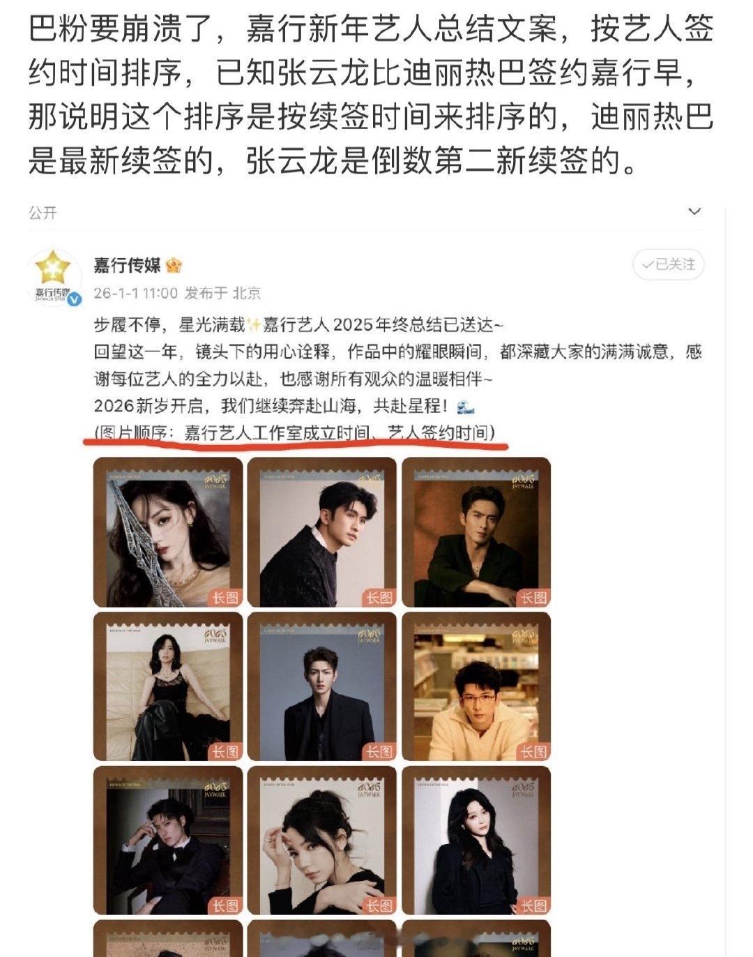 嘉行今天发总结博,说排名按艺人签约时间,但是张云龙进公司的时间比迪丽热巴早却排在后面,有人猜是按续约时间排的嘉行怎么可能放弃迪丽热巴这颗摇钱树,暗搓搓点了几次了嘉行这是在回应迪丽热巴解约吗