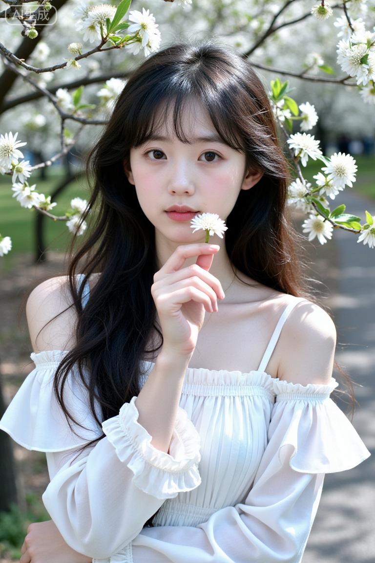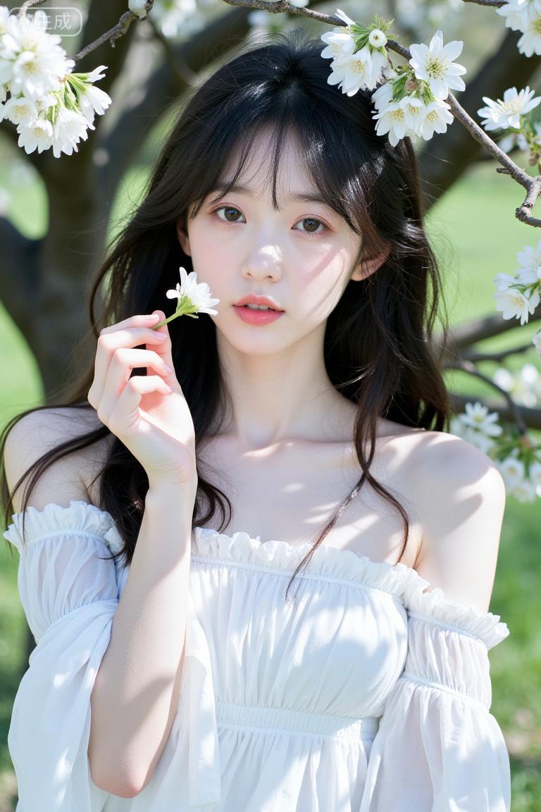 花树下的白裙甜妹好治愈 露肩纱裙裹着柔纱袖,像把春日的风揉进裙摆里,拈着花站在枝丫下,连光斑都裹着软乎乎的甜~ 发丝蹭着花影,温柔得像从春景里长出来,这就是森系甜妹的氛围感吧!温柔白裙少女