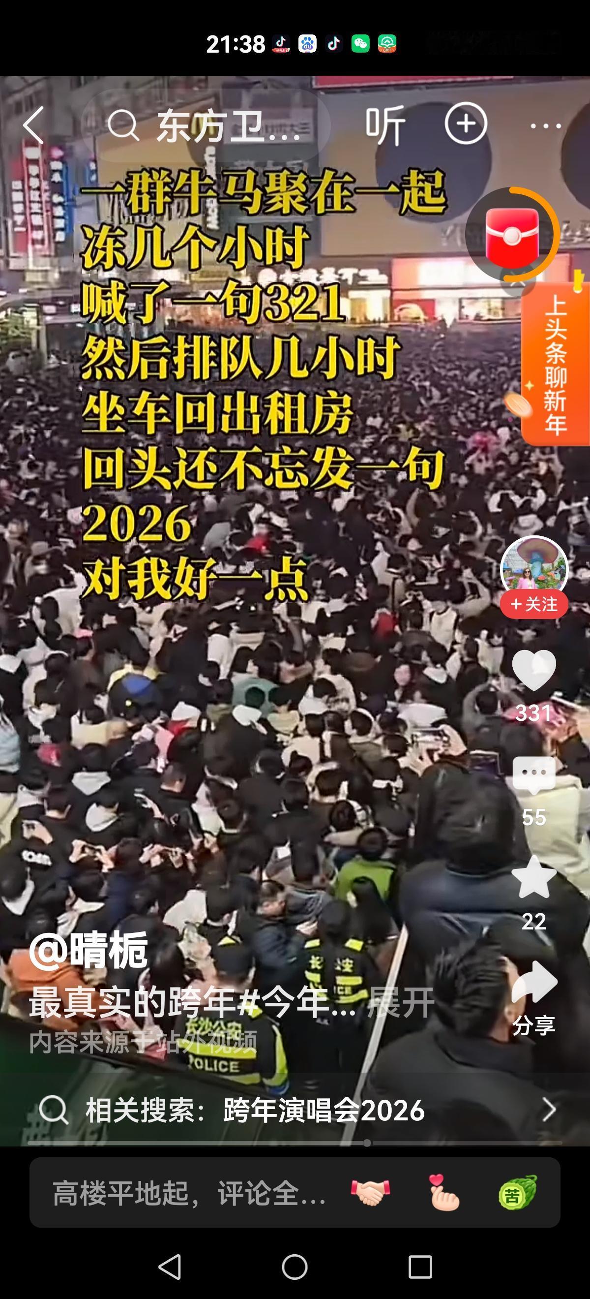 【人山人海去跨年】 殊不知跨年2026 跨年五湖四海 一群牛马聚在一起 冻几个小时 喊了一句:321 然后排队几个小时 坐车回出租屋 回头还不忘发一句: 2026 对我好一点 这就是跨年真实感受,也是年轻人的热情与真诚,年轻就是一股冲动,不要去嘲笑,因为他们年轻。