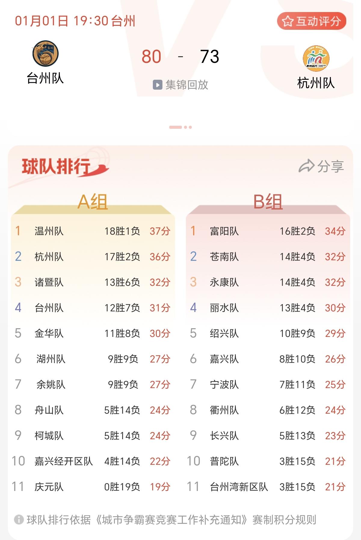 2026年首场浙BA城市争霸赛,今晚在台州队与杭州队之间展开。最终,经过激烈的pk,台州队主场以80:73战胜杭州队。此战过后,台州队以12胜7负,排名a组小组赛第四名。为八强之路,再添了一场胜绩。 台州队的下一场比赛,是1月10日晚上,该队将会和金华队,上演终极pk。到时候,这场比赛,将决定两队,由谁获得八强门票。 目前台州队有胜场优势,以及净胜分优势。当然金华队,也有主场优势。如果下一场比赛金华队胜台州队14分以上,则金华队出线。如果台州队获胜,或者台州队输给金华队14分以下。则台州队获胜。