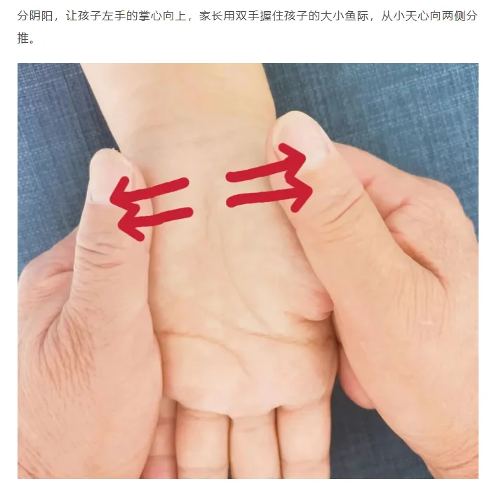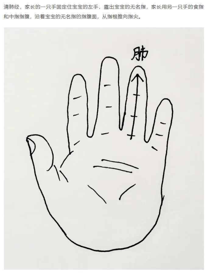 ⭐️⭐️推荐推拿穴位:揉小天心3分钟,一窝风5分钟,补肾5分钟,清板门5分钟,分阴阳2分钟,清肺经3分钟,清天河水3分钟。(如图)