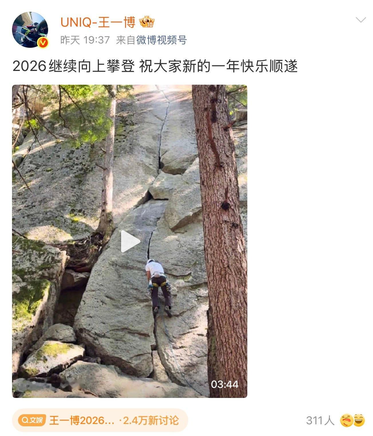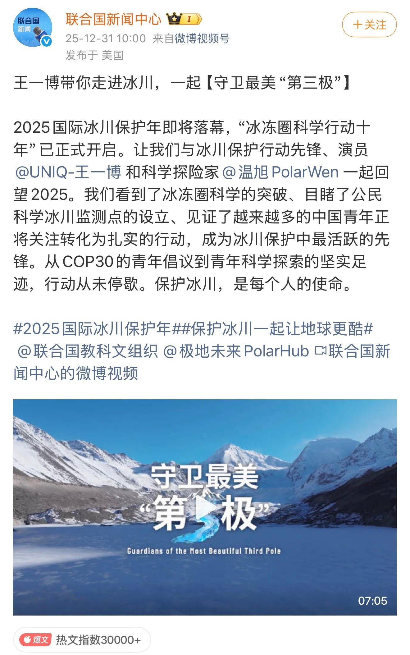 1231联合国新闻中心发布的王一博冰川保护宣传片播放量已经快4000w了1月1日当天发的新年祝福“2026继续向上攀登”3h播放破千万,现在1900w+了,这个关注度王一博真厉害了👍