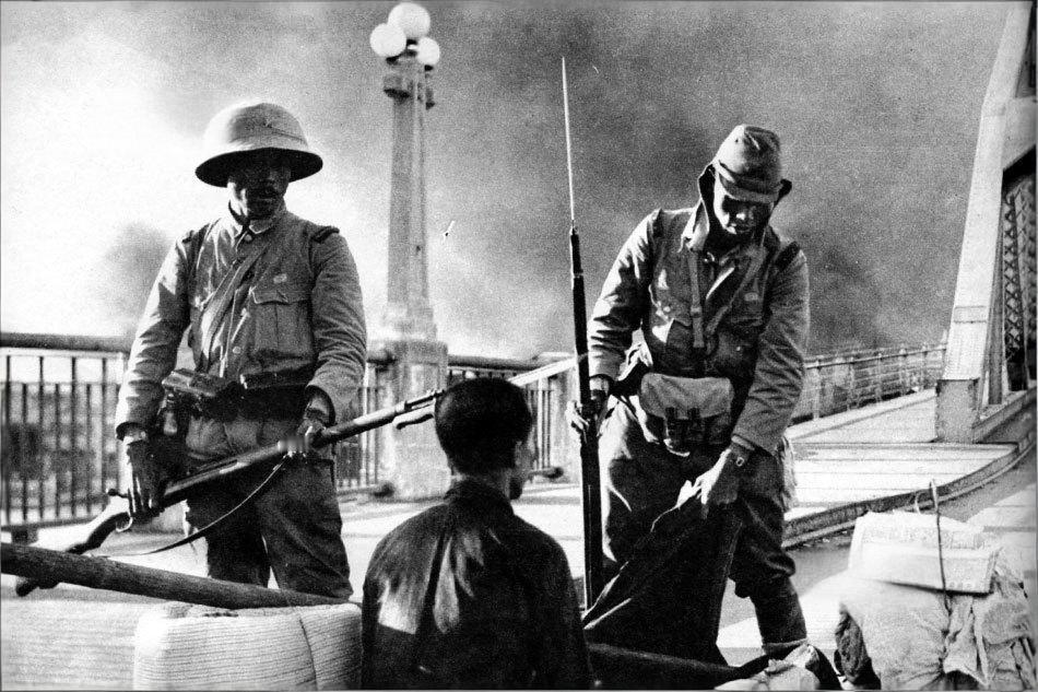 1938年10月广州沦陷后:侵华日军第18师团鬼子在海珠桥上对过桥的中国平民进行