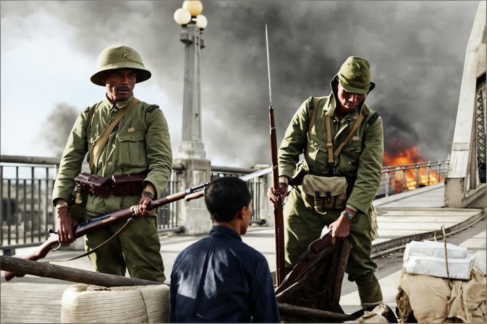 1938年10月广州沦陷后:侵华日军第18师团鬼子在海珠桥上对过桥的中国平民进行严格搜身检查。 照片中,两名日军士兵全副武装,一人持三八式步枪带刺刀站立警戒,另一人弯腰对一名中国男子进行搜身,该男子双手置于身后,姿态屈从。 1938年10月12日,日军第21军在大亚湾登陆,迅速推进。10月21日,日军第18师团未经激烈巷战占领广州市区。广州作为华南最大港口和交通枢纽,其沦陷标志着中国海外援助通道进一步被封锁,与武汉会战相呼应,推动抗日战争进入相持阶段。 占领后,日军立即在市区要道设立检查站,对来往平民进行搜身、盘查,防范游击队和抵抗者。同时实施宵禁、搜捕、抢掠,广州人口锐减,市民生活陷入恐怖。类似搜身用于威慑民众,常伴随殴打或枪杀。