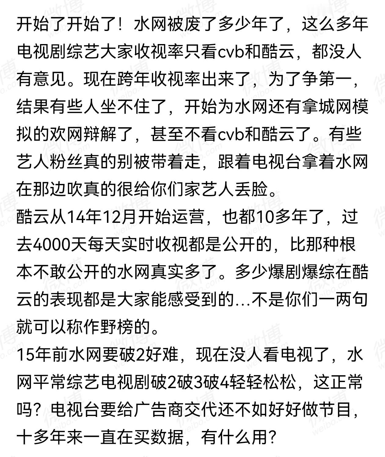提到跨年收视率,关于城网、欢网、酷云、cvb,就不要把历史尘封的数据再拉出来了吧。平常大家只认酷云和cvb,别在新年第一天为那种预制的数据洗白。这年头看电视的人比十五年前少太多了,怎么可能比十五年前更容易破2破3?江苏今年收视前三峰,薛之谦、罗云熙、张韶涵拿下。浙江今年收视前三,张信哲、周传雄、跑男团。