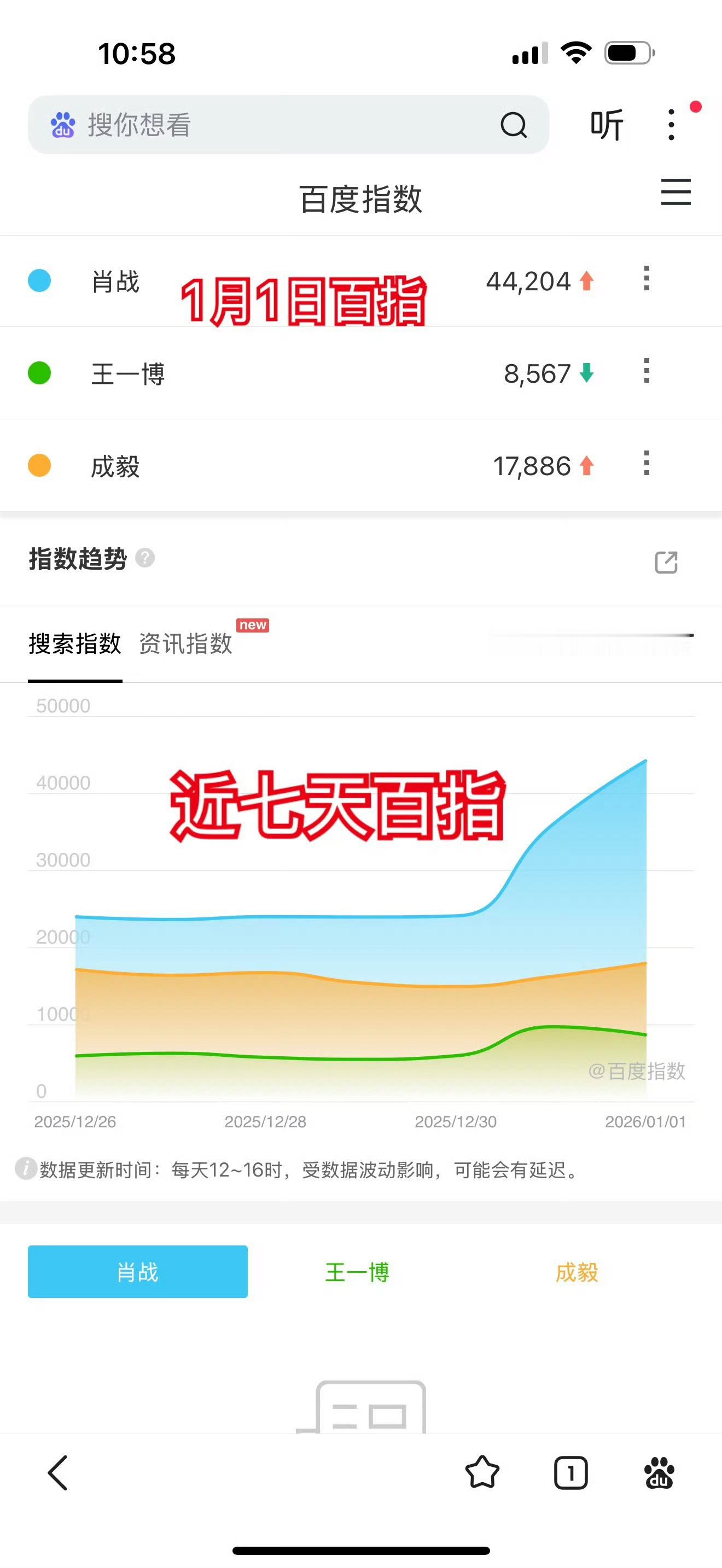 飞升和影视大妈不是最喜欢比较数据嘛,特别是影视大妈,不是最爱比微指吗,给你拉出来了最近七天的微指,肖战,王一博和成毅,来比啊