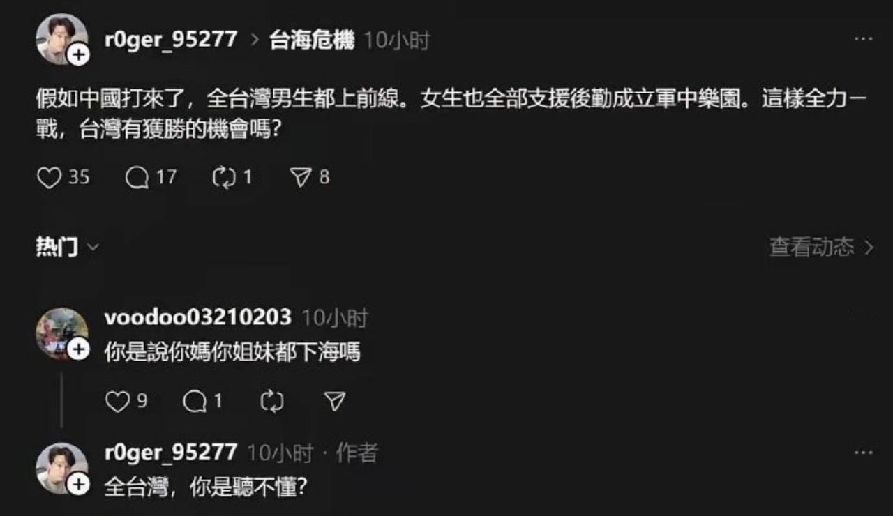 台蛙:如果大陆打过去,就全体男人上战场,全体女人在后方加入“军中乐园” 人怎么可以无知,扭曲,变态到这种地步!简直到了没有人性令人发指的地步了!之前戴玮珊的“慰安妇自愿”言论已经震碎三观了,他这更过分了! 这种极端言论就是对历史上最肮脏,最残暴的军国主义思维的模仿啊! 首先这是对成千上万被日本军国主义制度迫害的女性先人的侮辱,同时又是对当代台湾女性的亵渎! 这种反人类暴行你居然美化成宣传口号!这是在物化女性,随意分配成供人取乐的战利品和工具,剥夺其个人尊严! 这就是军国主义和法西斯思维!还居然偷换概念美化成某种“奉献”、“后勤保障”。可笑至极! 同时也严重撕裂两岸同胞的民族情感!侮辱了台湾同胞抗日史上的巨大牺牲!你这种恶魔逻辑是已经被历史唾弃和谴责的了! 难道你是当初日本留下的后裔?台湾本土有尊严的人不会有这个思维,被殖民几十年就逆来顺受,歌功颂德?站不直!要脸不?!台伪蛙军