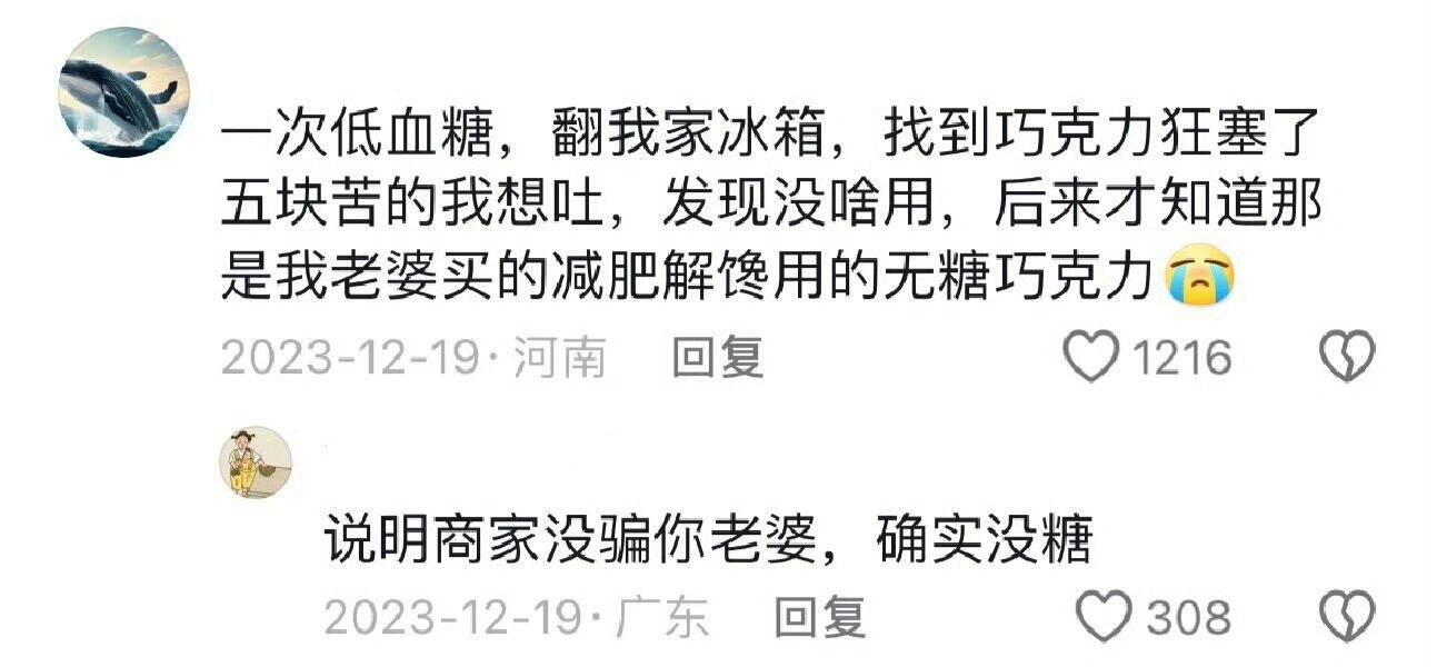 一次低血糖,翻我家冰箱,找到巧克力,狂塞了五块苦的我想吐,发现没啥用,后来才知道那是我老婆买的减肥解馋用的无糖巧克力