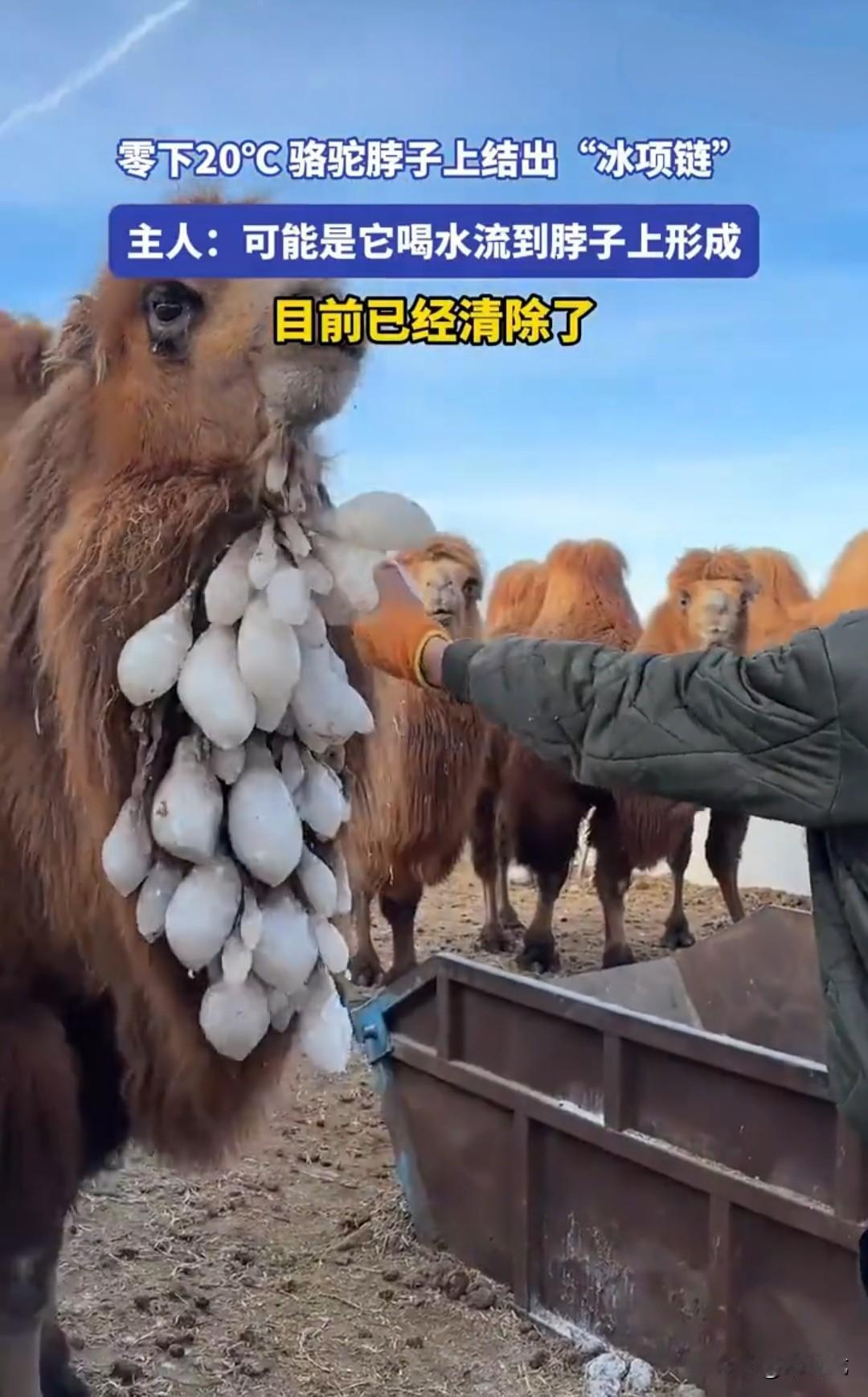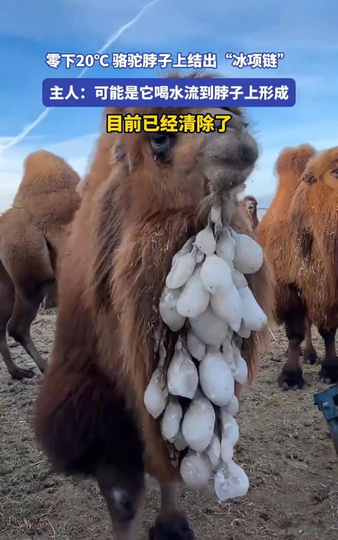 零下20度的内蒙古草原上,骆驼脖子上都结出了一串醒目的“冰项链”。 据主人介绍,这是骆驼喝水时,因为天气太过严寒,骆驼喝水时间又太长,水慢慢从嘴巴流到脖子,再流动前胸,就形成了这一大串小的如鸡蛋、大的如芒果形状的冰块。 乍一看,就像脖子上挂了一串晶莹剔透的“冰项链”,一走起来,冰项链就“哐当哐当”地响。 主人想帮它清除掉,但骆驼还不愿意,仰起头连连后退:“看我多帅呀,它们都没有,就我一个人有。” “你别动 ,我要留着得瑟得瑟。” 有强迫症的人,看到这种情况会觉得很不舒服,就像是挂在自己脖子上似的,总想着把它清除掉。