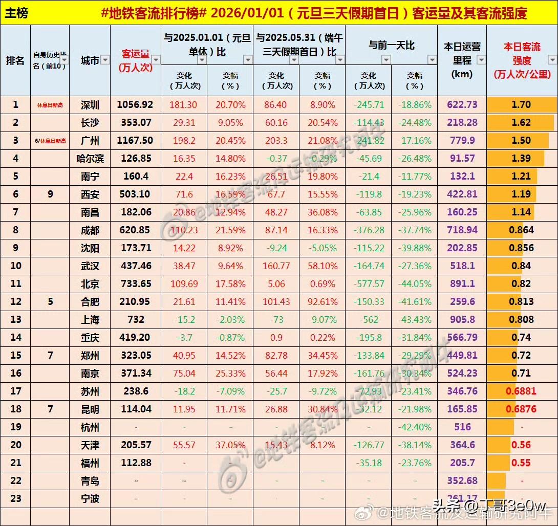 杭州地铁客流量元旦节首日仅为320万人次左右,低于长沙、南京[呲牙][呲牙][呲牙] 爆料 地铁客流排行榜 中国地铁客流日报 昨日客流 元旦 排行榜 周四 2026年1月1日 星期④,元旦 全国重点城市轨道交通客流量排行榜: 广州:1167.50万广州身边事 深圳:1056.92万深圳地铁 北京:733.65万北京身边事 上海:732.00万 成都:620.85万 西安:503.10万西安爆料 武汉:437.46万武汉地铁 重庆:419.20万重庆地铁 南京:371.50万 长沙:353.07万长沙身边事 杭州:320万+杭州爆料 郑州:323.05万郑州地铁 苏州:238.60万 合肥:210.95万合肥身边事 天津:205.57万天津爆料 南昌:182.06万南昌地铁 沈阳:173.71万 南宁:160.40万南宁身边事 青岛:120万+青岛爆料 哈尔滨126.85万哈尔滨地铁 昆明:114.04万昆明爆料 福州:112.88万 宁波:100万+