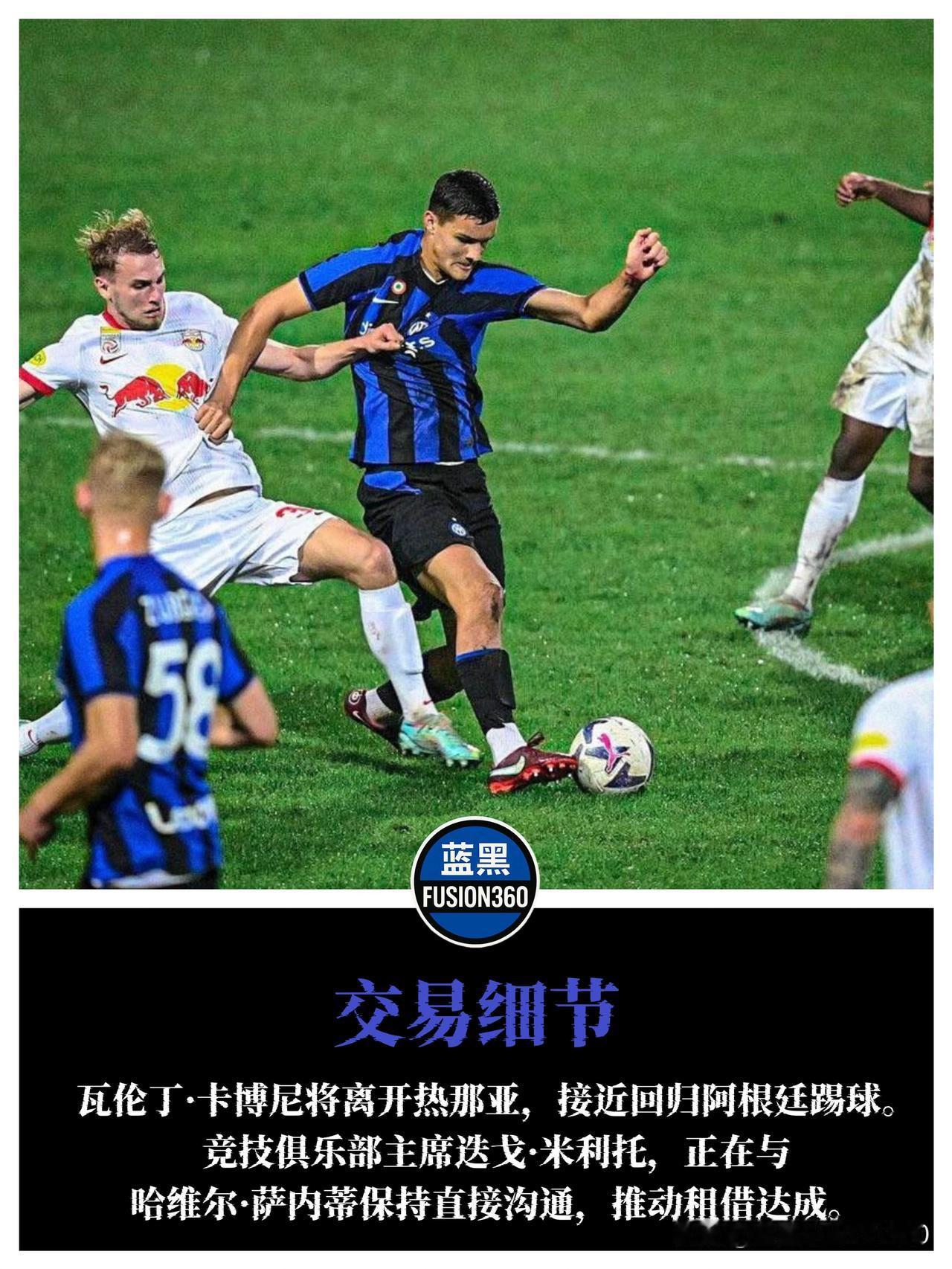 “王子”致电“萨内蒂”!三冠王老友联手做局,卡博尼回阿根廷练级! 这不仅仅是一笔转会,更是一次属于内拉祖里的“家庭通话”。当迭戈·米利托拿起电话拨通哈维尔·萨内蒂的号码时,瓦伦丁·卡博尼的未来就已经注定了。 据名记罗马诺团队的消息,这位阿根廷天才前腰即将结束在热那亚的失意时光,重返阿根廷加盟竞技队。 尽管意甲的卡利亚里也对他有意,但在两位“三冠王”功勋深厚的友谊面前,竞争对手毫无机会。作为竞技队的主席,米利托与国米副主席萨内蒂一直保持着“直接联系”,这份老战友的情面成为了交易的关键。 让米利托亲自调教国米的未来之星,这笔“借调”交易怎么看都是双赢。去阿根廷练级,总比在热那亚坐板凳强。 看着当年的22号和4号如今在管理层联手操盘,你有没有一种恍如隔世的感觉?国际米兰 💙🖤