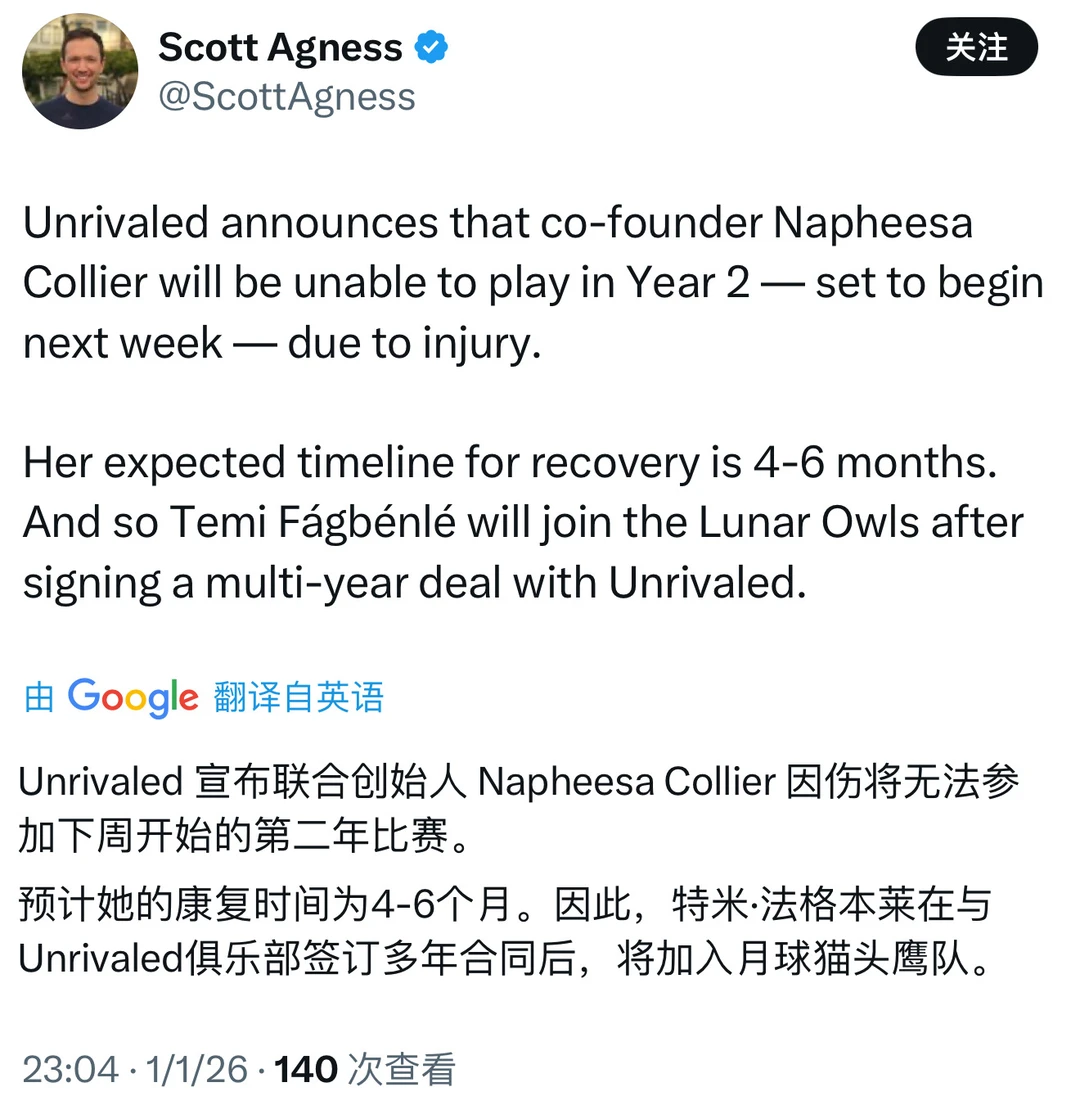 了解科利尔想法的消息人士透露,她对无法参加Unrivaled感到失望,但也很庆幸在康复进程停滞不前时,能够通过这个新的方案继续推进治疗。