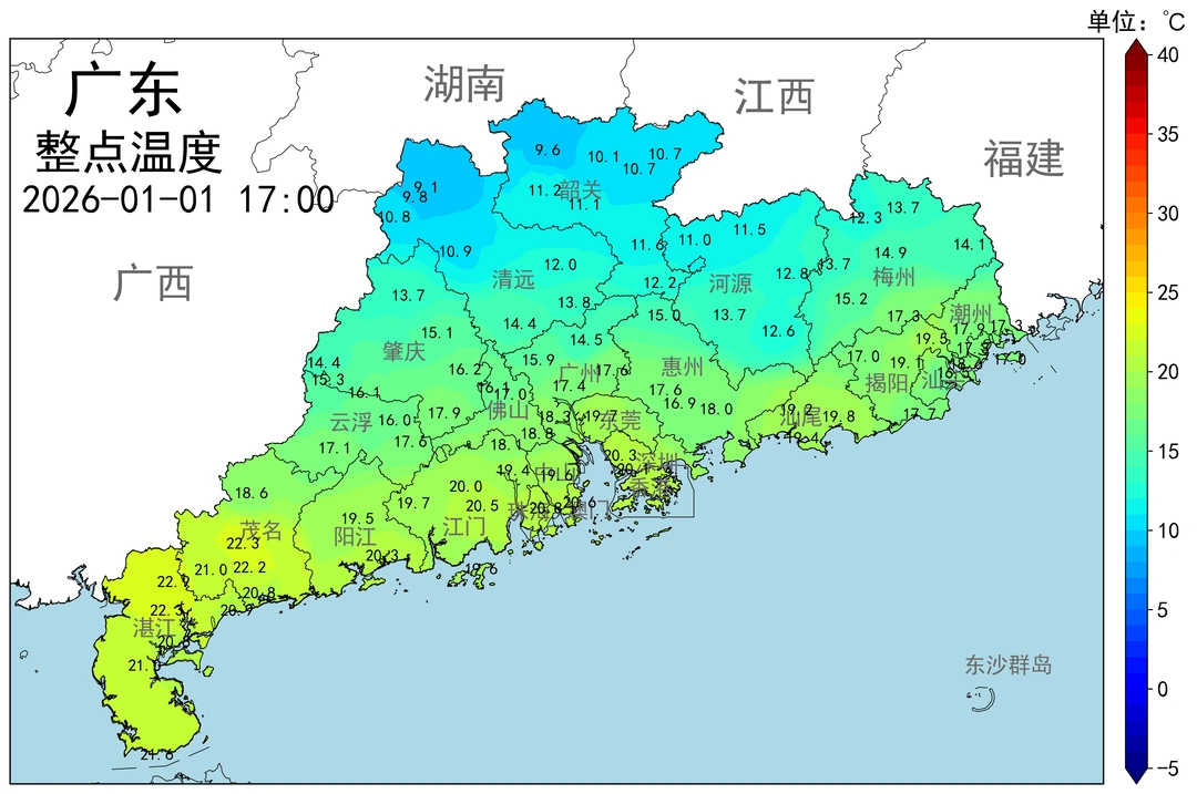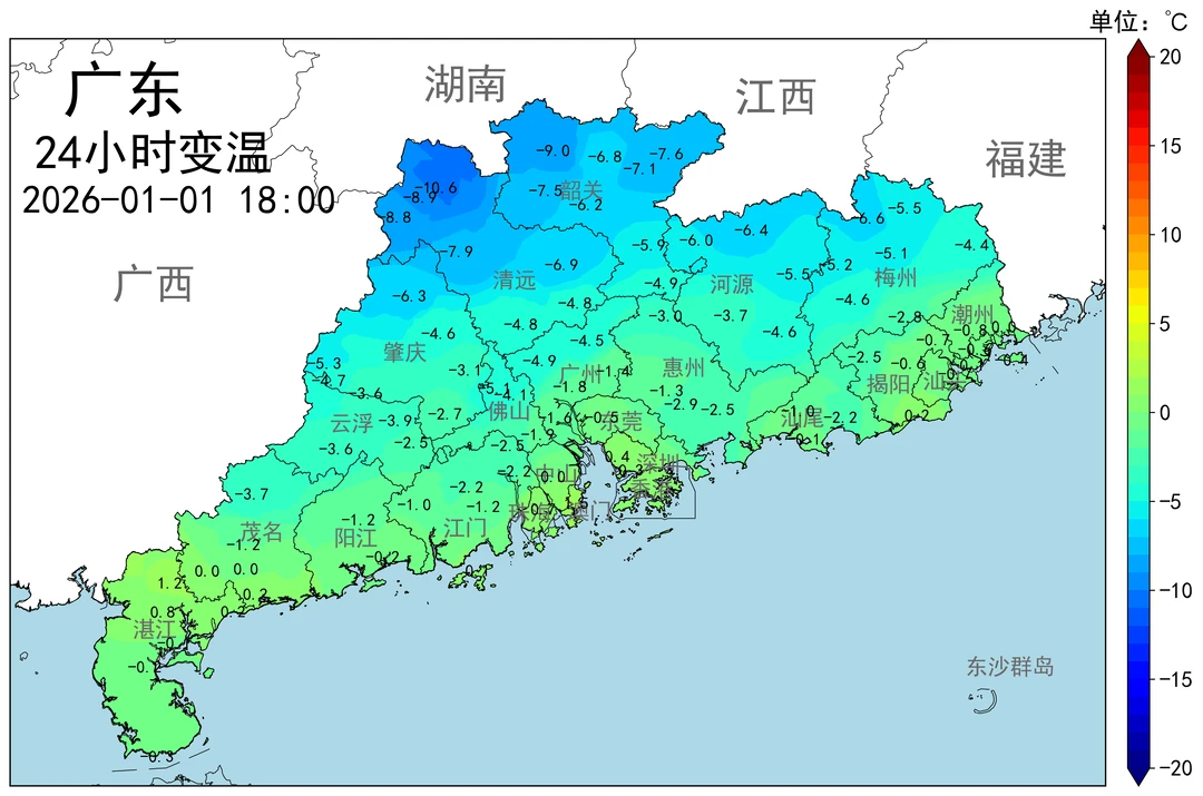 天气多变,真情不变。 今天是2026年第一天,㊗️各位铁粉平安健康,事事快乐顺心,感恩对小编一如既往的信任和支持🫰🏻❤️。 今天是元旦,冷空气正在快速南下广东凑热闹。截至今天(1月1日)下午6点,一股中等冷空气已经全面影响粤北,清远,韶关,河源,梅州普遍出现了6~8度降温,💣局部降温超过10度,白天最高温普遍仅剩下10~12度左右。 今晚(1月1日晚),冷空气将到达广东珠三角北部~粤西北,气温将出现6~8度降温。今晚深夜~2日凌晨,冷空气就全面影响广东沿海,风力加大到5~6级大风,局部有7级妖风🌬️🥶 预估,今晚深夜~1月2日,随着冷空气到达广东沿海,粤北气温还将继续有3~4度降温,广东沿海地区普遍有7~8度降温,局部降温超过10度。⚠️最低温将出现在2日早晚,3日早晚(沿海最低温在8~10度徘徊,广州最低温将跌破8度,粤北最低温在0~3度左右,山区局部地区最低仅剩-3度) 1月2日,全省天气逐步转为晴天🌞,阳光占比高达85%~95%☀️,大部分地区转为“万里无云”的天气。早晚温差大,尤其需要注意早晚时分的保暖,天气相当干燥,⚠️注意做好防火,防干燥,防静电准备。 升温预测,1月4日~5日全省将迎来2~3度升温,尤其是沿海地区普遍有4~5度升温,天气逐步转暖。⚠️但是,1月6日~8日,新的冷空气补充,气温再次迎来5~6度降温,天气再次回归元旦假期的寒冷低温🥶,甚至气温将再创新低。⚠️注意及时做好防寒保暖。 因此,未来8天(1日晚~8日)广东天气的普遍寒冷(晴天🌞寒冷,昼夜温差大),真正持续的升温将从1月9日开始,将迎来长达5天的升温,气温累计回升7~8度,局部10度升温。然而,随后新的冷空气将再次带来降温,我们将密切关注,及时告知小伙伴。