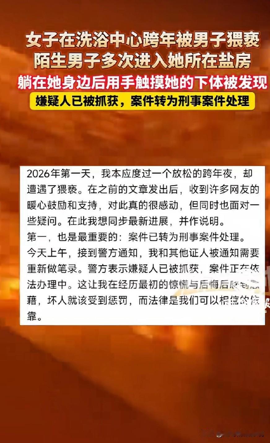 浙江杭州,女子到某洗浴中心跨年,因为折腾了半夜才做完项目,女子很累,深夜在汗蒸房休息时睡得太沉了,中途惊醒,发现身旁躺着一个头发稀少、身体肥胖的男子,但她当时太困了,翻个身又睡着了。睡梦中,女子感觉有只手在摸她的下体,一下彻底惊醒了。男子 在她的质问下承认了事实,但女子发现对方的情绪不对,怕激怒他对自己更不利,就放他走了。随后找到经理调取了监控,看到画面后女子崩溃,立马报了警。 女子元旦放假,因为前期工作紧张, 她想着过一个有新意的跨年夜,放松一下身心。 女子购买了一家知名的洗浴中心的套餐票, 想在洗浴中心,过一个放松的跨年夜。 因为是节假日,女子想着有可能人多,但到达洗浴中心后却发现,和她有相同意向的人真是太多了。 本想着放松跨年,却每个项目都在排队,光进场就排了两三个小时,累的腿都快直了。 可1000多块钱的票,她又不舍得浪费,女子只好忍着劳累和不适强撑着。 而更让女子无法忍受的是,洗浴中心简直是人山人海,连坐下休息的地方都找不到。 就连拿个水果,也都要排队等很久。 虽然累的不行,但现场气氛热烈,到处喜气洋洋。 后面女子本着既来之则安之的态度, 安心的排队做项目。 等做完了所有的项目,已经到了后半夜,女子真的累极了。 他在汗蒸盐房找到了休息的地方,当时那个地方只有女子一个人。 想着洗浴中心的人多应该很安全。 女子由于太累,加上洗浴后盐房里的温度又高,女子很快就睡着了。 她平时就睡觉比较沉,这一觉睡得啥也不知道了。 突然,睡梦中女子潜意识的感觉不对劲,她一下惊醒了。 朦胧中她使劲睁了一下眼,发现身边躺着一个秃头、肥胖的男子。 但女子当时太累太困,意识都是恍惚的,只睁了睁眼就又睡了过去。 不知过了多久,女子再次惊醒,并明确地感觉到有只手在摸她的下体。 女子一个机灵,彻底惊醒了,他睁眼的那一刻,正好看到一只手快速的缩了回去。 女子顿时打了个寒颤,一身冷汗湿透了全身。 她立刻大声质问躺在她身旁的那个男子:你在干什么?为什么跑到我这里来了? 对方当时并不承认自己动手,他支支吾吾的搭不上话来。 后面他又说,他是不小心碰到了女子的身体。 女子气的让他道歉,对方吭哧了半天,才勉强说了句:对不起。 女子当时所处的环境,已经关掉了大灯,她看的不是太清楚。 但她面对一个男子,明显的感觉到对方的情绪不对头。 女子害怕他做出更过激的行为,就没敢再刺激他。 女子用强装镇定的语气呵斥男子,让他立即立刻离开! 那个男的才悻悻的走了。 对方一离开,女子顿时心理和生理以上感到极度的不适,她一阵恶心,差点吐出来。 此刻她特别后悔来洗浴中心跨年,本来是想放松身心,没想到自己反倒遭遇了这样的事。 女子找到洗浴中心的经理,调取了汗蒸房门口的监控。 众人终于看清了那个男子的长相。 但洗浴中心的经理表示,无法立刻确定那个人是谁。 女子还了解到,当时那个男的来来回回,多次进出她休息的汗蒸房。 但因为女子睡得太死,竟然一点都没有察觉到,她又后怕又后悔,几乎崩溃。 她万万没想到,自己在洗浴中心这样的环境,却遭到了猥 亵。 她甚至不敢想象,在自己深睡的过程中,那个男人对她做了什么。 一想到这些,女子就忍不住犯恶心冒冷汗。 女子将自己的遭遇发到了网上,希望用自己的亲身经历告诉女生们。 遇到这种情况,不要因为害怕而放走坏人。 一定要要让他们受到惩罚,法律一定是可以相信的依靠。 《刑法》第237条:以暴力、胁迫或者其他方法强制猥 亵他人或者侮辱妇女的,处5年以下有期徒刑或者拘役。 聚众或者在公共场所当众猥亵他人的,或者有其他恶劣情节的,处5年以上有期徒刑。 “其他方法”是指暴力、胁迫以外的使被害人不知抗拒或不能抗拒的方法。 男子利用女子熟睡,无法反抗的状态实施猥 亵行为,符合该条款中的客观要件。 且男子主观上具有故意,若经认定情节属实,将构成强制猥 亵罪,需承担相应的刑事责任。 《民法典》第1198条:宾馆……公共场所的经营者、管理者或者群众活动的组织者,未尽到安全保障义务,造成他人损害的,应当承担侵权责任。 因第三人的行为造成他人损害的,由第三人承担侵权责任; 经营者、管理者或者组织者未尽到安全保障义务的,承担相应的补充责任。 经营者、管理者或者组织者承担补充责任后,可以向第三人追偿。 洗浴中心作为经营场所,对消费者负有安全保障义务。 女子在洗浴中心遭猥 亵,洗浴中心虽因人员众多难以立刻确定侵权人。 但洗浴中心,未能有效保障消费者的人身安全,未尽到合理的安全保障义务。 女子可要求洗浴中心承担相应的补充责任,洗浴中心承担责任后,向该男子追偿。 目前,嫌疑人男子已经被抓获,案件转为刑事案件,正在处理中。 对此你怎么看? 关注@赵哥的法律观