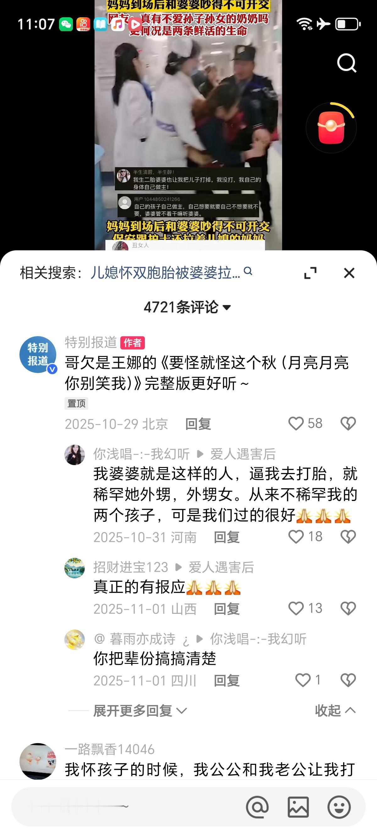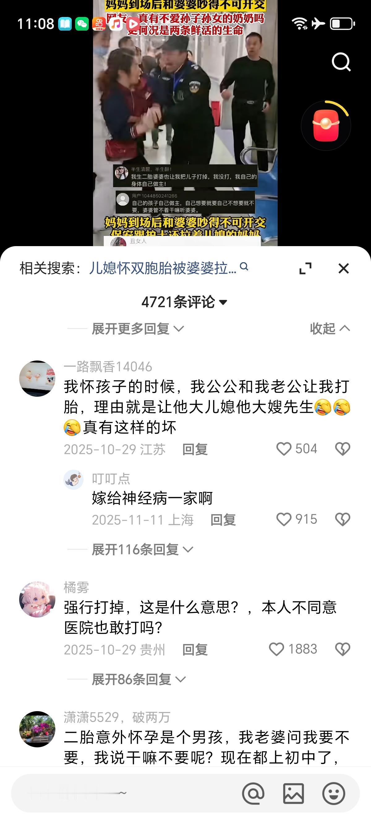 婆婆通过算命得知儿媳妇怀的双胞胎是女孩,就强行拉着儿媳妇去打胎,丈夫也不拦着,等儿媳妇娘家妈赶到的时候都晚了。 娘家妈很生气,找亲家大闹,护士和保安怕打起来,就把娘家妈拉走了,期间娘家妈仍然大喊大叫的反抗着,一直试图挣脱开护士和保安的束缚,好上去继续找亲家理论干架。 理解不了这种行为,一次性怀两个孩子是多幸福的事情啊,别人得一个一个生,儿媳妇一次给生俩孙女还不好。 丈夫也全程旁观,好像媳妇肚子里怀的孩子不是他的似的。媳妇也不敢反抗,看媳妇妈妈反应的那么抗拒,媳妇应该是想要孩子的,但架不住婆家人多,自己孤立无援的,又没有收入来源,怕离婚才同意的吧。 有网友表示自己怀孩子的时候就让她打胎,理由竟然是让大嫂先生孩子。还有网友反应自己婆婆不想让她生孩子。 真的是费解啊,竟然有婆婆不希望孙子孙女多的。