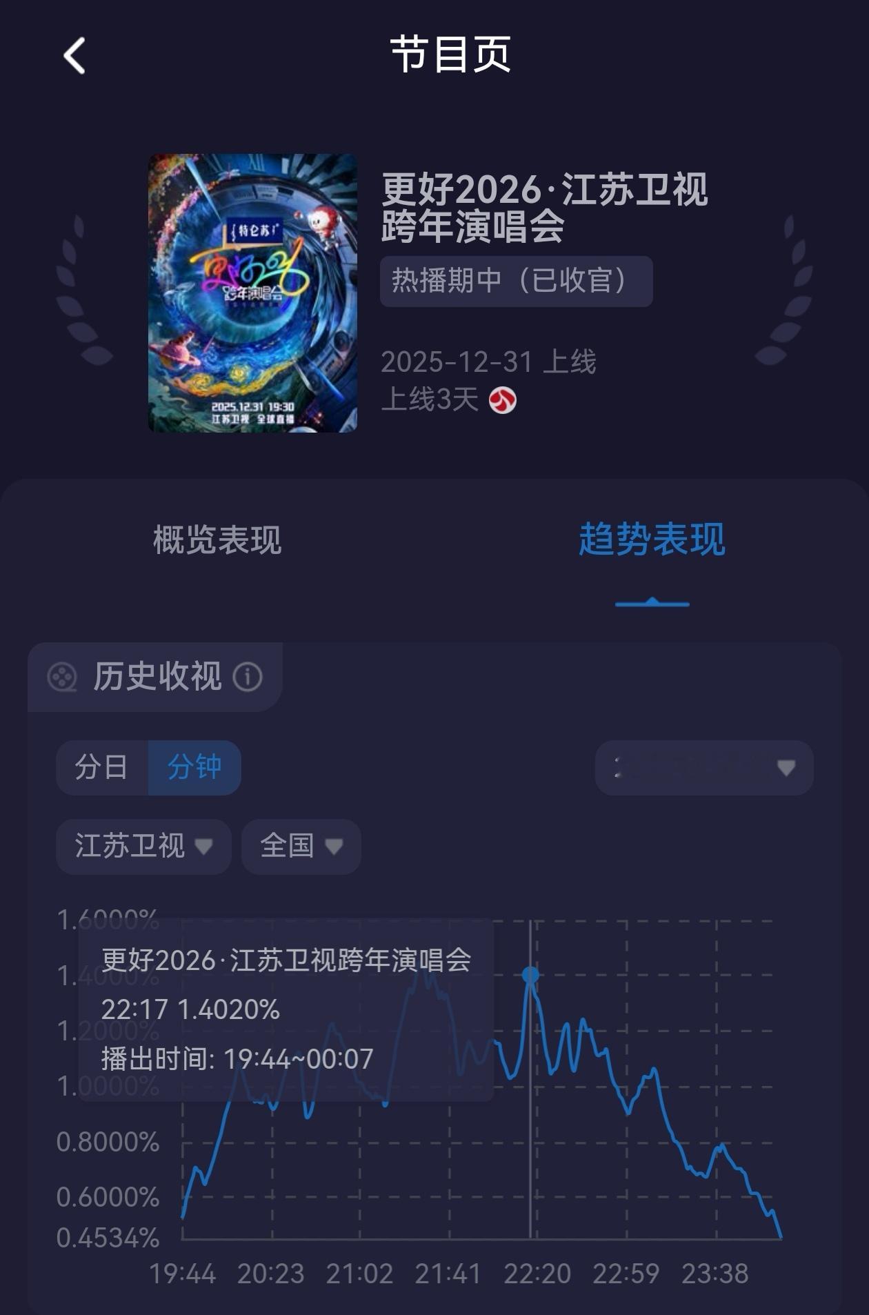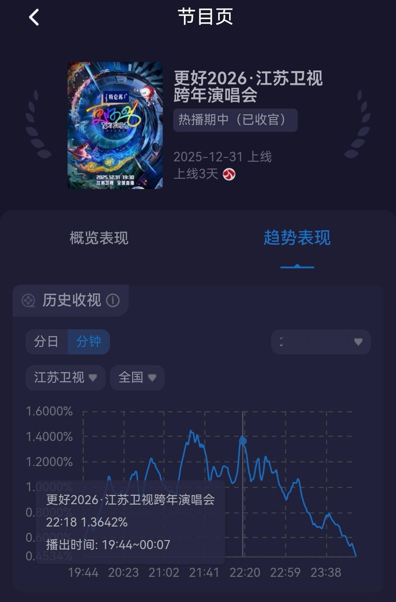 周深厉害!江苏跨年录播了三首歌,结果《小美满》一路把江苏跨年收视拉到当晚第二峰值1.41。结果后面接着的人罗云熙姚晓棠《最后一页》没接住,收视开始往下掉。这可能就是为什么周深在香港办个唱,江苏跨年依旧要找他录播的原因了。之前只看峰值,没想到江苏的这个峰值是两首节目的交叉点。 跨年收视率