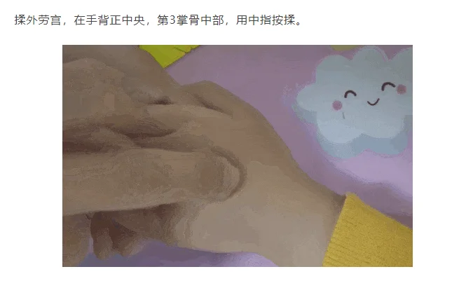 3、揉外劳宫,在手背正中央,第3掌骨中部,用中指按揉。