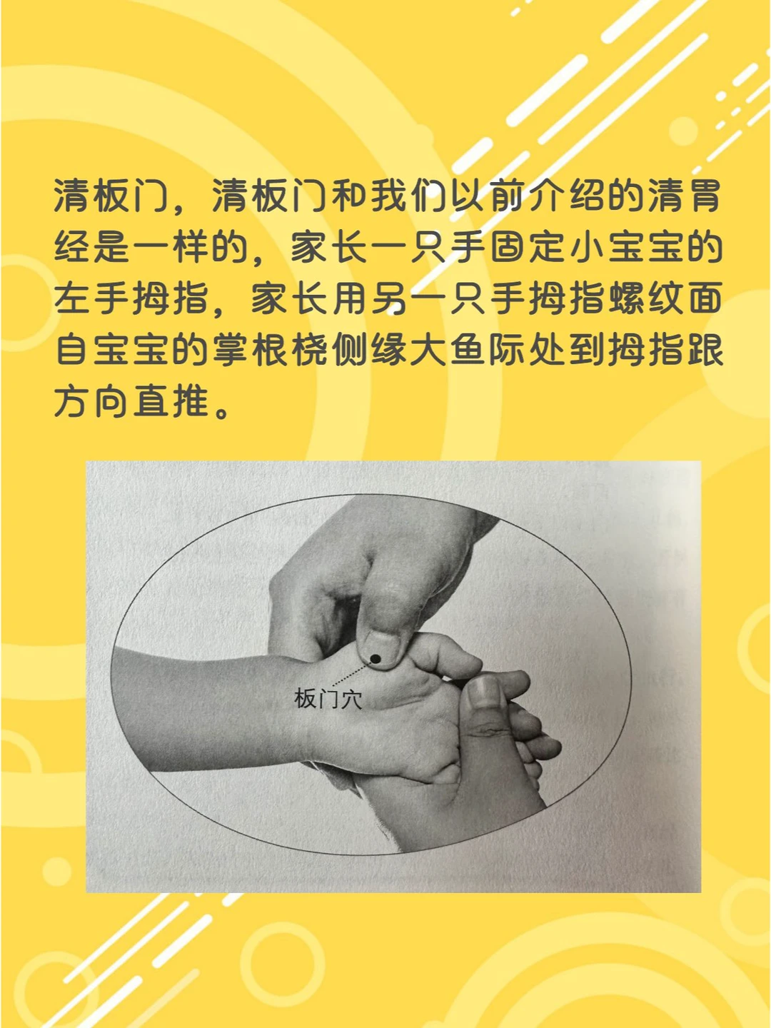2、清板门,清板门和我们以前介绍的清胃经是一样的,家长一只手固定小宝宝的左手拇指,家长用另一只手拇指螺纹面自宝宝的掌根桡侧缘大鱼际处到拇指跟方向直推。
