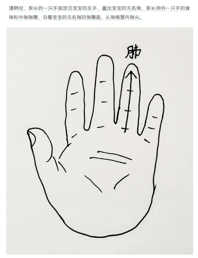 6、清肺经,家长的一只手固定住宝宝的左手,露出宝宝的无名指,家长用另一只手的食指和中指指腹,沿着宝宝的无名指的指腹面,从指根推向指尖。