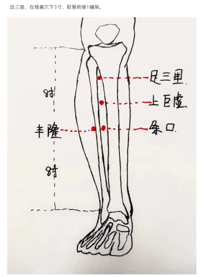 4、足三里,在犊鼻穴下3寸,胫骨前缘1横指。