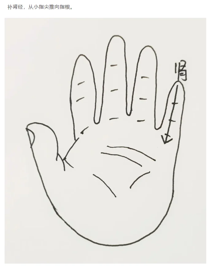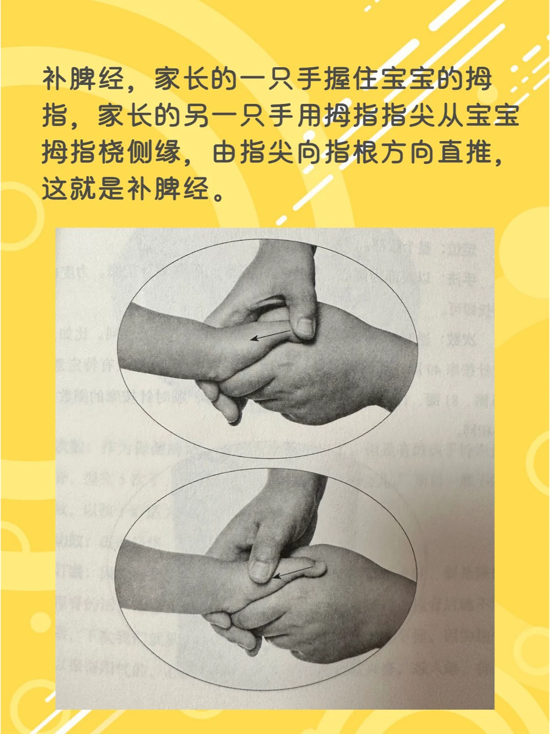 1、补脾经,家长的一只手握住宝宝的拇指,家长的另一只手用拇指指尖从宝宝拇指桡侧缘,由指尖向指根方向直推,这就是补脾经。