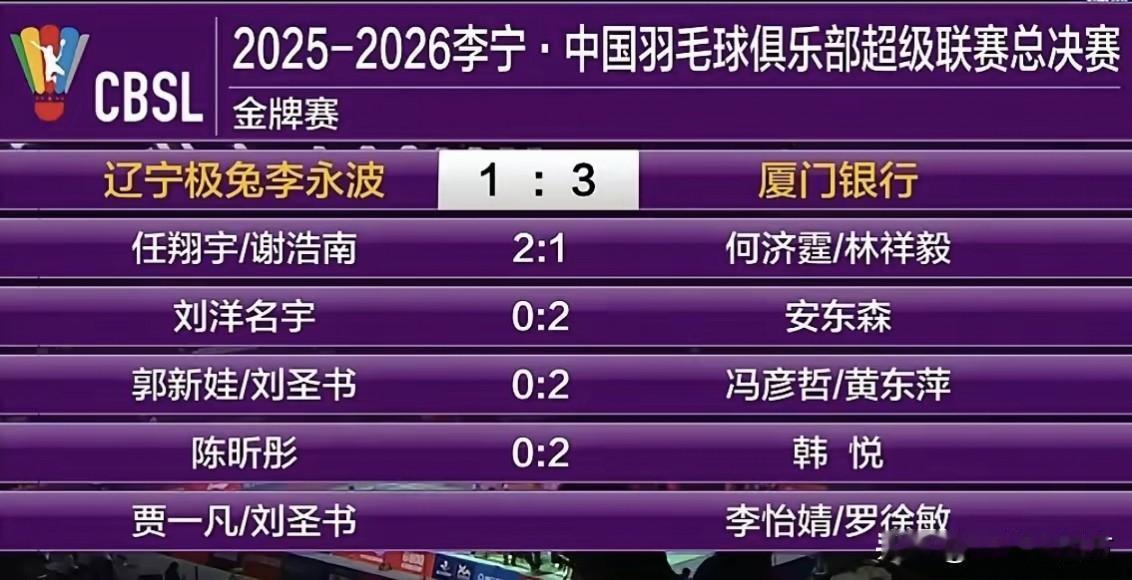 中国羽毛球俱乐部超级联赛混团冠亚军决赛刚刚在长沙中南大学体育馆结束,厦门银行队3-1逆转击败辽宁极兔李永波队,成就羽超四冠王伟业。首盘男双,辽宁队的任翔宇/谢浩南以15-13、14-16、15-12险胜厦门队的何济霆/林祥毅,第二盘男单,辽宁队未派出最强的翁泓阳,而是由小将刘洋名宇出战,他以7-15、15-17不敌世界排名第三的丹麦外援安东森,双方战平,关键的第三盘混双,厦门队世界排名第一的冯彦哲/黄东萍以15-6、15-8速胜郭新娃/刘圣书,帮助队伍拿到赛点,第四盘女单,厦门队的韩悦以15-7、15-6轻松击败陈昕彤,为队伍锁定胜局。