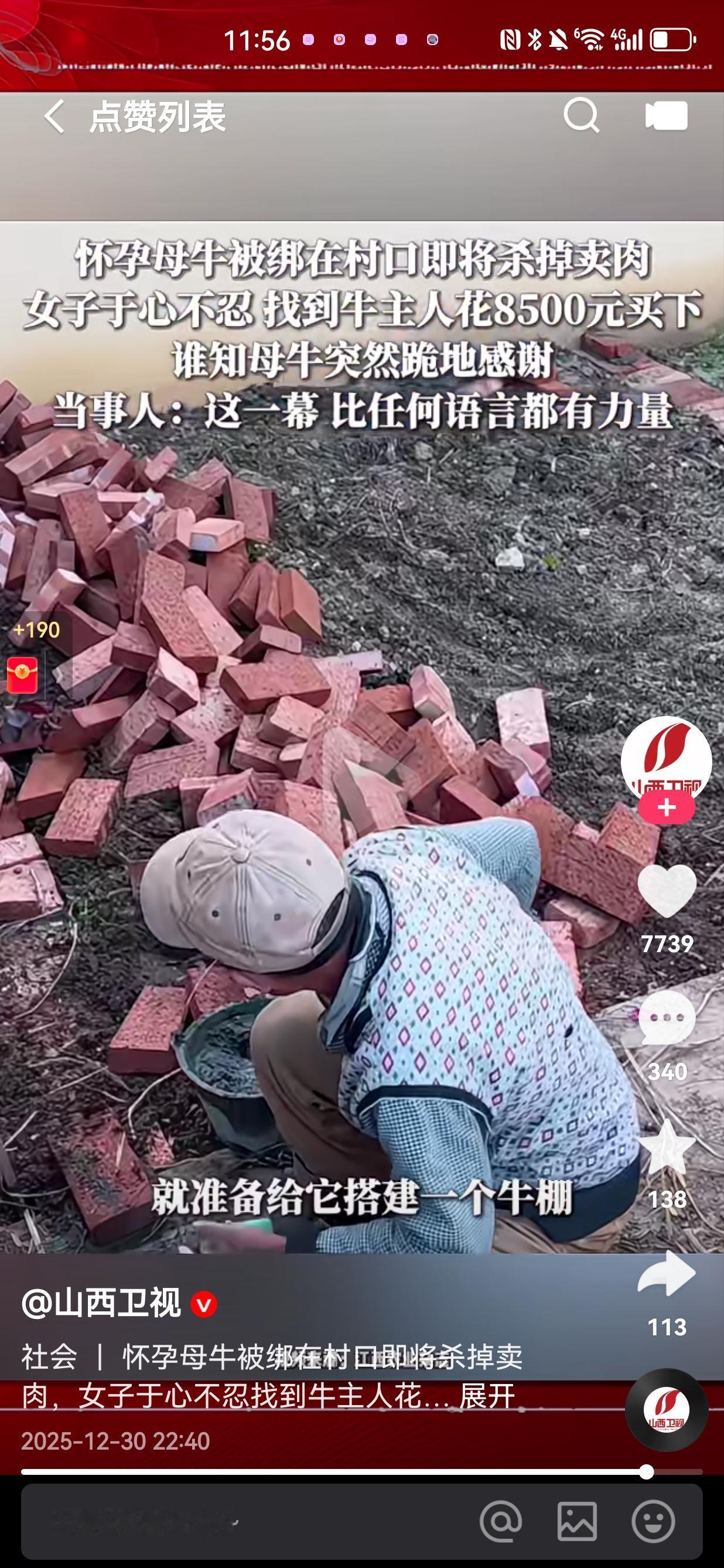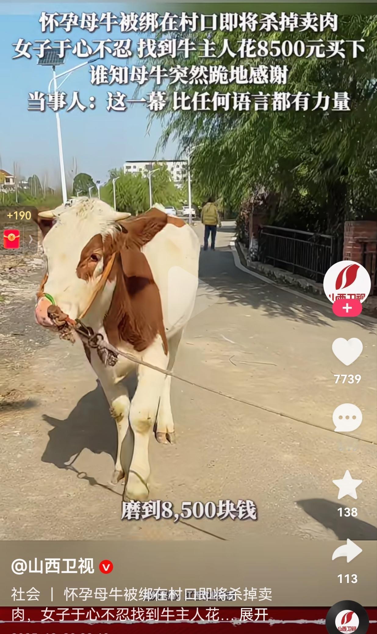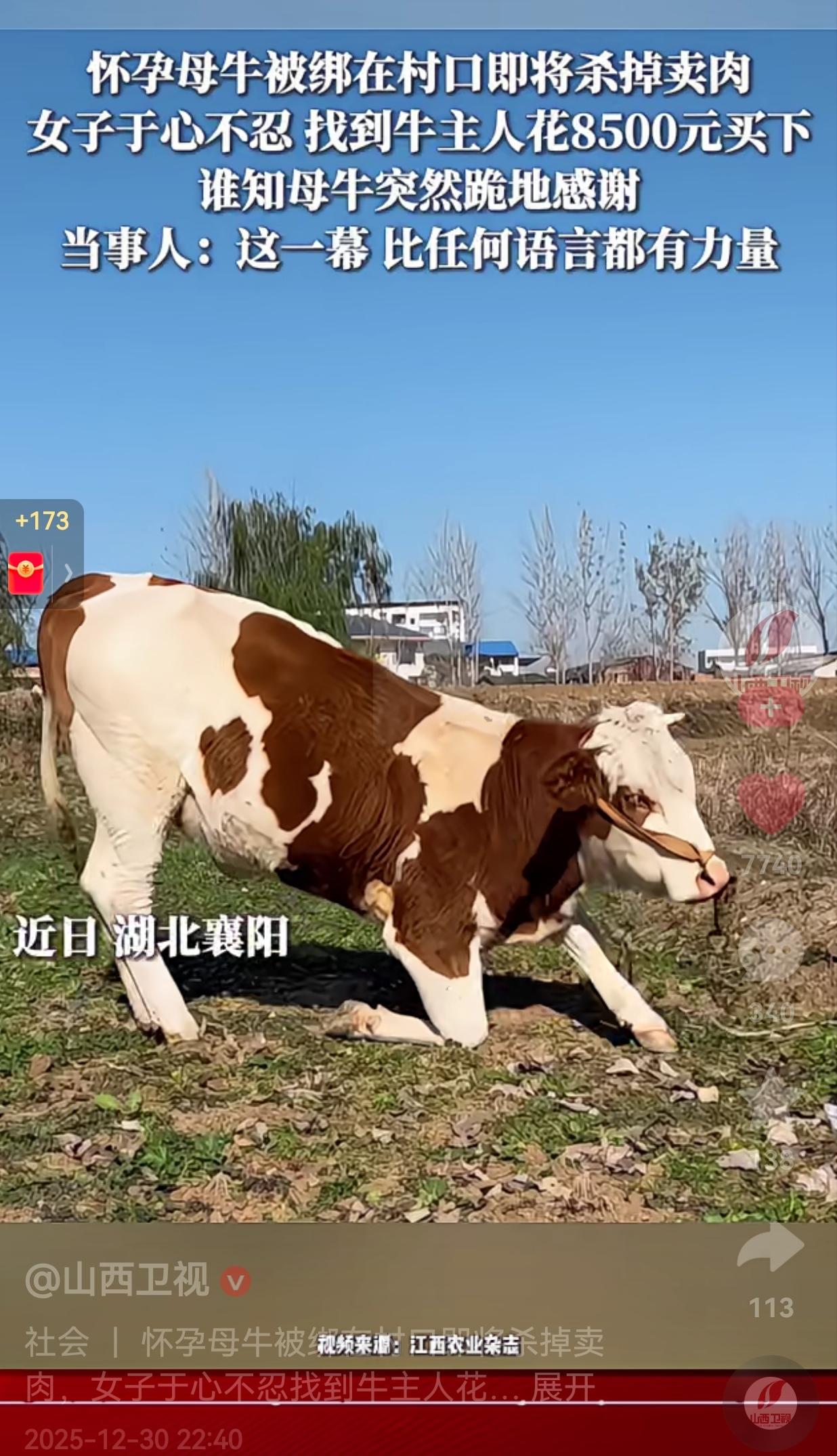 看哭了!怀孕母牛被绑在村口即将被杀掉卖肉,女子于心不忍,找到牛主人花8500块钱将牛买下,牛知道自己躲过一劫,竟然下跪表示感谢。网友:妈呀!这一跪直接给我整破防了!万物有灵真的不是说说而已,为善良的小姐姐点赞! 11月26号晚上,湖北襄阳一村口栓了一头牛,女子听见这牛一声声哀叫,心一下子就揪起来了。一打听才知道,牛主人家里急着用钱,早就跟人说好,第二天就把这头怀崽的母牛宰了卖肉。 女子看着母牛那可怜的模样,实在不忍心,当场就找牛主人谈一谈,打算买下这头牛。 牛主人一开始张口就要9000块,女子跟他磨了好半天,最后才以8500块把牛买下来。 牛主人还念叨着,这头牛怀孕了明年就要生牛崽子了,由于牛怀孕跟人差不多,得九十个月呢。 转天一早,女子去村口牵牛,没想到啊:这头母牛好像知道自己逃过一劫了,突然前腿一弯,“噗通一声”就跪在了女子面前。 那一下跪得特干脆,一点声响都没有。后来女子说起这事,眼圈还红着,直说这8500块花得太值了。 救下牛之后,女子和家人一刻也没闲着,立马搬红砖、和水泥,专门给母牛搭牛棚,还说当天就能把棚子搭好,让这头怀着崽的母牛能安安稳稳住着,等着小牛犊落地。 网友看到后评论说:“8500块救了两条命,这钱花得太值了!小姐姐心眼太好了,好人一定有好报!” 还有的网友说:“小姐姐不仅救了牛,还搭牛棚,这才是真正的善良啊,她不是一时兴起,是长久的负责!” 老话说“万物有灵”,真遇上了才知道这话多实在。牛不会说话,可它用最笨的法子,回应了人的善意。 我们平时忙着挣钱、追这追那的,常常忘了,对生命的敬畏、对弱小的心疼,才是咱骨子里的善良。 这头母牛的一跪,不是跪啥恩惠,是生命和生命之间最真的情分。希望咱都能守着这份柔软,对身边的东西多些慈悲。 毕竟啊,善意从来不会被辜负,就算是一头牛,也记着你的好呢。