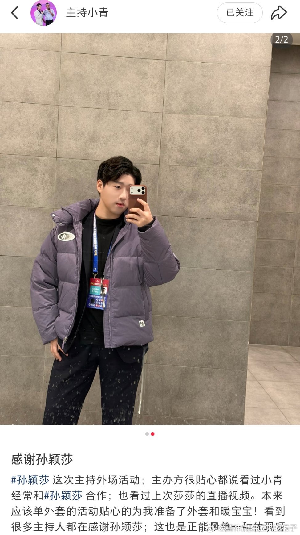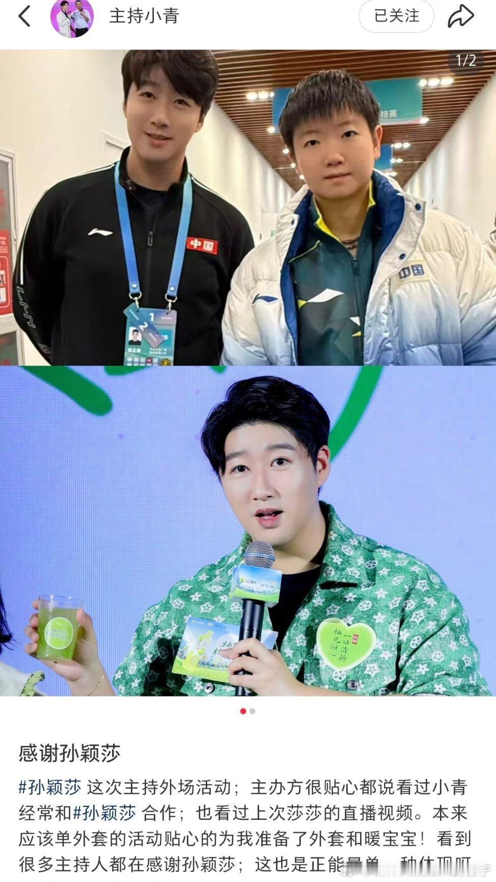 主持人小青:感谢孙颖莎这次主持外场活动,主办方很贴心的说看过小青经常和孙颖莎合作,也看过上次莎莎的直播视频。本来应该单外套的活动贴心的为我准备了外套和暖宝宝!看到很多主持人都在感谢孙颖莎,这也是正能量的一种体现呀