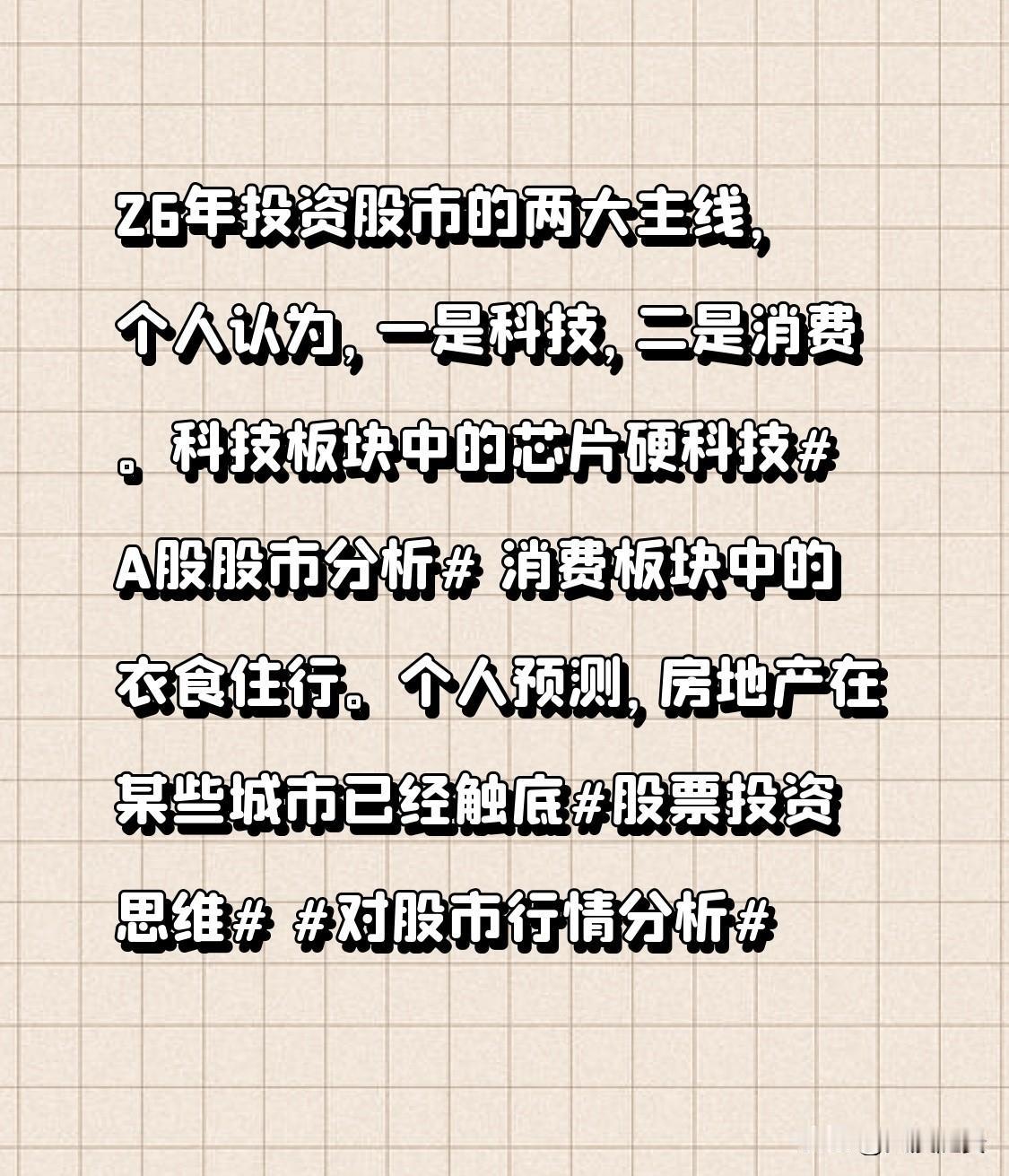 26年投资股市的两大主线,个人认为,一是科技,二是消费。科技板块中的芯片硬科技A股股市分析 消费板块中的衣食住行。个人预测,房地产在某些城市已经触底股票投资思维