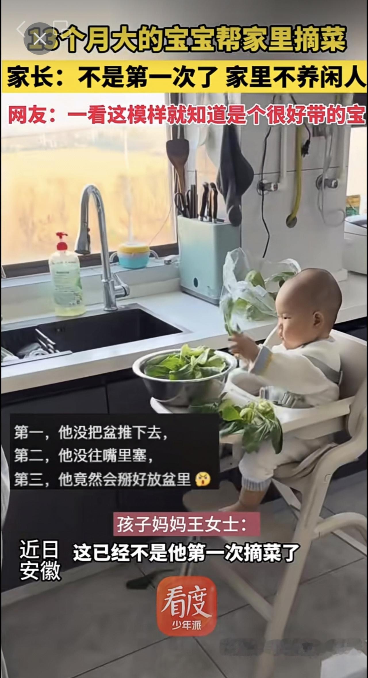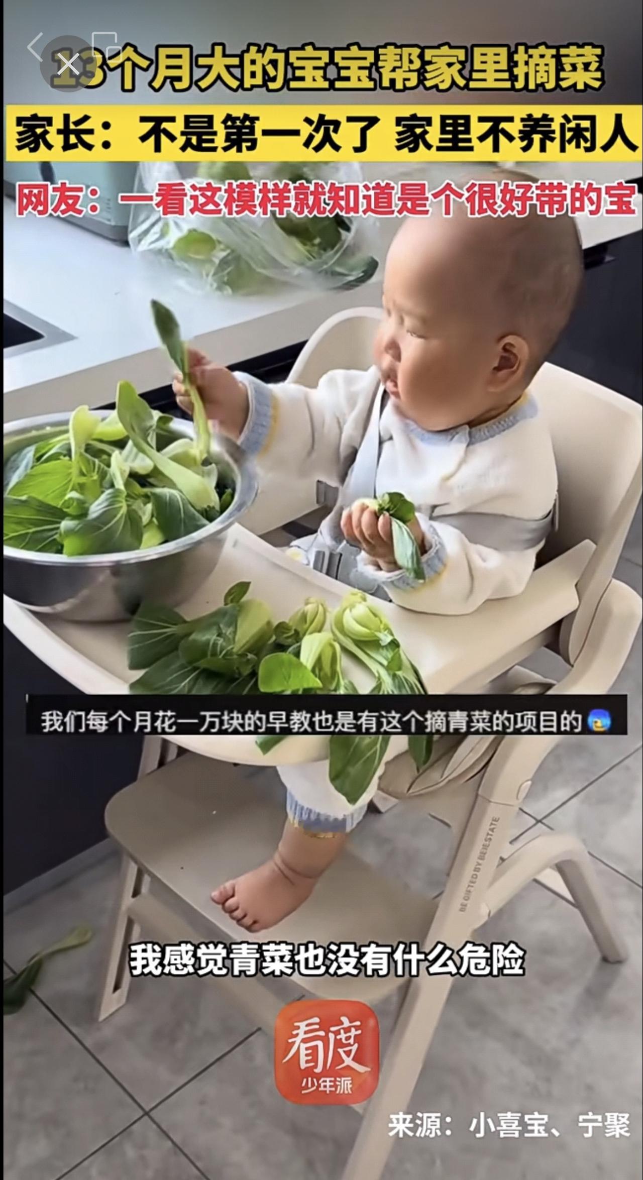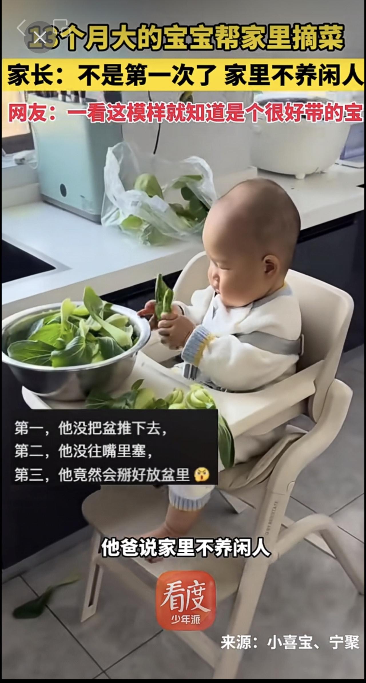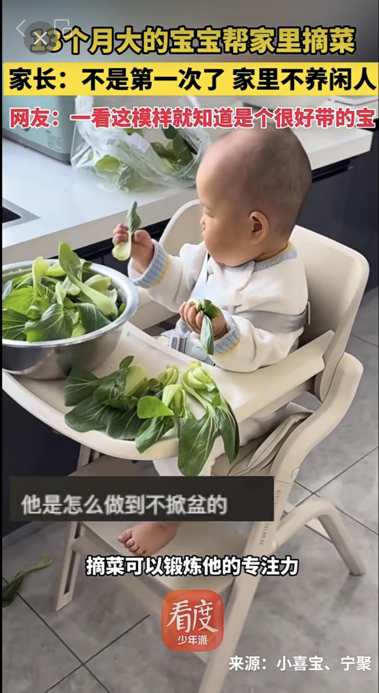 13个月大的宝宝帮家里摘菜 家长:不是第一次了 家里不养闲人 网友:一看这模样就知道是个很好带的宝