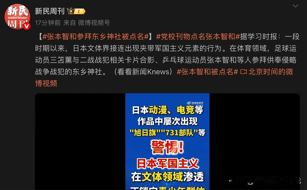 终于等来了官方公开重视日本军国主义在文体领域渗透的报道了。这次被点名的文体领域名人有很多,其中最出名的要属张本智和了,这家伙简直就是败类级别的反派人物,居然跑去参拜了东乡神厕,作为有着中国血统的人居然跑去干这种没底线的事儿,看来是没有一点良知和是非判断能力了。我就想知道,这家伙还能来中国参加比赛么?咱们会不会对其进行制裁?张本智和