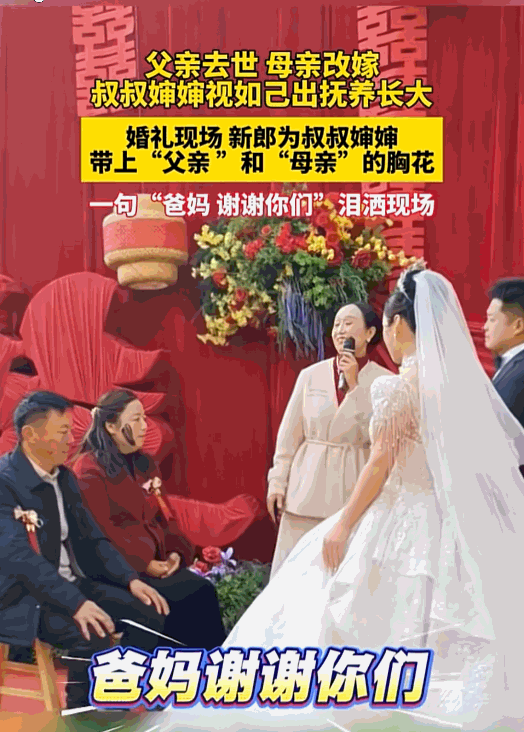 泪目了!近日河南封丘,在一场婚礼上,新郎突然把叔叔婶婶请到了舞台上,并亲手将他们身上的胸花换成了爸爸和妈妈,而当观众们知道这背后的故事时,都忍不住落泪了,原来叔叔婶婶不是父母但胜似父母。 最近,河南封丘一场热热闹闹的婚礼正在按部就班地进行着,红色的绸缎装点着舞台,台下宾客说说笑笑,满是喜庆的氛围。 可就在仪式进行到关键时候,新郎却突然停了下来,他的目光穿过人群,落在了台下的叔叔婶婶身上,接着快步走下台,在众人惊讶的目光里,稳稳地把两位老人一一扶了起来,慢慢走到舞台中间。 等老人站定,新郎转身从礼仪手里拿过两朵新胸花,又小心翼翼地摘下叔叔婶婶胸前原本的普通亲属胸花——和其他亲友戴的款式一样,随后把分别绣着“爸爸”、“妈妈”的胸花,仔细地别在了他们的衣襟上。 整个动作稳稳当当、郑重其事,没说多余的话,却让现场原本的喧闹一下子安静了下来。 一开始,台下的宾客都有点懵,不知道新郎为啥要做这么个打破常规的举动。 直到旁边知道内情的亲友轻声把背后的事说出来,现场的气氛瞬间变了,大家的惊讶慢慢变成了动容,不少人眼角都红了,悄悄抹起了眼泪。 这时候大家才明白,眼前这对被叫做叔叔婶婶的老人,虽然和新郎没有血缘关系,却在他孤苦无依的时候,扛起了做父母的责任,用大半辈子的辛苦把他拉扯大,这份超越血缘的养育之情,早就比亲生父母的恩情还要深了。 这场换胸花的举动,其实是对二十多年来相互陪伴的温情最好的回应,据知道内情的人说,新郎刚生下来没多久,妈妈就去世了,等到他八岁的时候,爸爸又因为意外突然离世,懵懂的孩子一下子就成了孤儿,人生一下子就走到了危险的边缘。 就在这难的时候,本来就靠着种地和打零工过日子、家里还有自己孩子的叔叔婶婶,没多想就果断把他接到自己家里照顾。 从那以后,叔叔婶婶从没把他当外人,把有限的钱和物资都尽量匀给他这个额外的孩子,衣食住行照顾得妥妥帖帖,不管是上学还是后来规划未来,都尽心尽力帮衬,从没让他觉得自己是寄人篱下。 新郎长大成人后,去了南方打拼,从一开始住地下室、啃馒头的艰难日子,到后来站稳脚跟、有了自己的小成就,心里一直记着要报答叔叔婶婶的养育之恩。 等自己有能力了,第一件事就是回老家给叔叔婶婶翻盖了新房子,好好孝敬他们,而这场婚礼上的换胸花,就是他对这份养育之恩最郑重的感谢。 这件事被传到网上后,很快就引起了大家的热烈讨论,成千上万的网友都来留言,字里行间全是感动和认同。 有网友感慨说:“生了孩子却不养,根本谈不上恩情;没生孩子却用心养大,这份恩情比山还重,这场胸花换得痛快,也换出了人世间最纯粹的善良。” 还有网友说:“这一刻才明白仪式感的分量,这不是故意煽情,而是对二十多年付出的郑重宣告,让两位老人的辛苦能被所有人看到。” 婚礼上这暖心的小插曲,看起来是新郎个人的感恩行为,实际上却反映出了当下社会里亲情本质的深层含义,也打破了大家心里“只有血缘才是亲情”的固有想法。 叔叔婶婶凭着“爱护自己的孩子,也爱护别人的孩子”的善心,给了孤儿一个温暖的家;新郎凭着“报答养育之恩”的真心,让这份付出有了圆满的结果,两个人一起,勾勒出了“你养我小,我养你老”的最美好的人间图景。 信息来源:商丘网络电视台