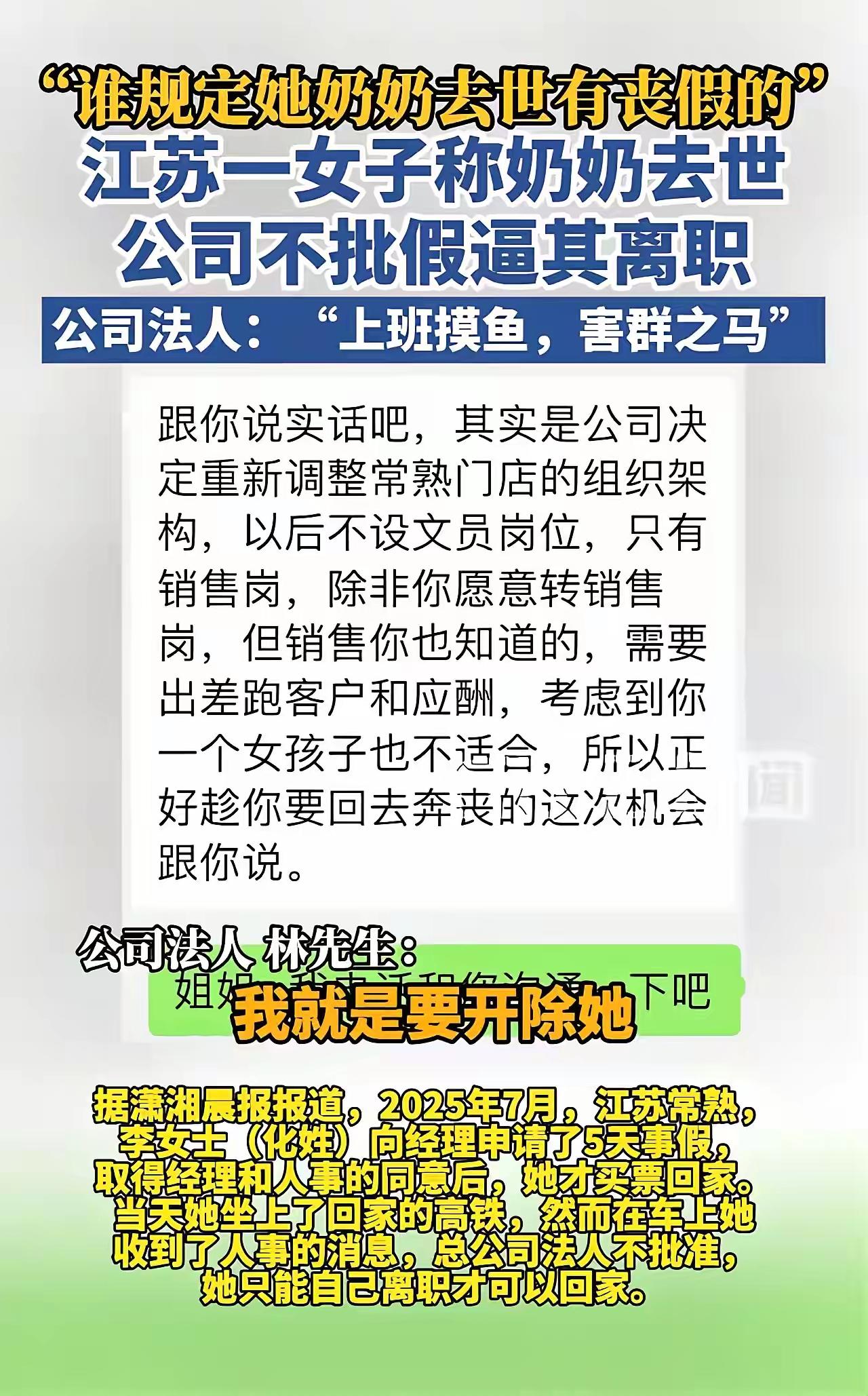“谁规定她奶奶去世有丧假的!“江苏,一女子奶奶去世,公司老板却不批假逼她离职!老板:“谁家爷爷奶奶不去世,这有什么好请假的……” 在这个快节奏、竞争激烈的社会里,职场似乎变成了一个没有温度的战场。刚刚那条新闻,让无数人为之扼腕叹息:江苏一名女子因为奶奶去世,申请了丧假,却被公司老板无情拒绝,甚至逼她离职。老板一句“谁家爷爷奶奶不去世,这有什么好请假的”,让人不禁质问:难道家庭的悲伤、亲人的离别,只是一场“工作之外”的事吗? 这不仅仅是一则职场冷漠的新闻,更是一面折射出社会价值观的镜子。我们习惯了在快节奏的生活中,将家庭、情感置于次要位置,甚至视为“私事”。但难道亲人的离去,就可以用“工作需要”来衡量?难道我们在追求事业成功的同时,就要牺牲掉最基本的人性关怀? 其实,很多人都曾在生命的某个瞬间感受到那种无助与孤独。特别是在失去亲人的时候,最需要的不是冷冰冰的“工作规则”,而是来自社会、来自企业的理解和温暖。可现实中,许多员工面对丧事时,往往只能忍痛忍受“被拒绝”,甚至被逼着“离职”——他们的悲伤、他们的家庭,都被无情地忽视。 这背后,折射出的是一种扭曲的价值观:在某些企业,利益高于人性,效率高于情感。而我们又该如何反思?难道企业的“规章制度”就能凌驾于人性之上?难道职场的“规则”就能成为漠视家庭、漠视生命的借口? 其实,尊重员工的家庭情感,不仅是企业应尽的责任,更是社会文明的体现。一个懂得关怀的企业,才能赢得员工的忠诚与敬意;一个充满人性关怀的社会,才能真正实现和谐共处。 这件事引发的讨论远远不止于一个员工的个人悲剧,它关乎我们每一个人的价值观:在追求成功的同时,我们是否还能保持那份对生命的敬重?在面对悲伤时,我们是否还能伸出那只温暖的手? 或许,下一次当你看到有人因为家庭而请假,或者有人因为失去亲人而痛苦时,你会想到:这个社会,是否还应该多一些理解和温暖?毕竟,没有人能预料生命的尽头,也没有人能承受无尽的冷漠。 让我们一起呼吁:尊重生命,关爱家庭,让职场不再冷漠,让社会多一些温暖。因为,只有这样,我们的未来才会更加美好。请假后身亡 丧葬假